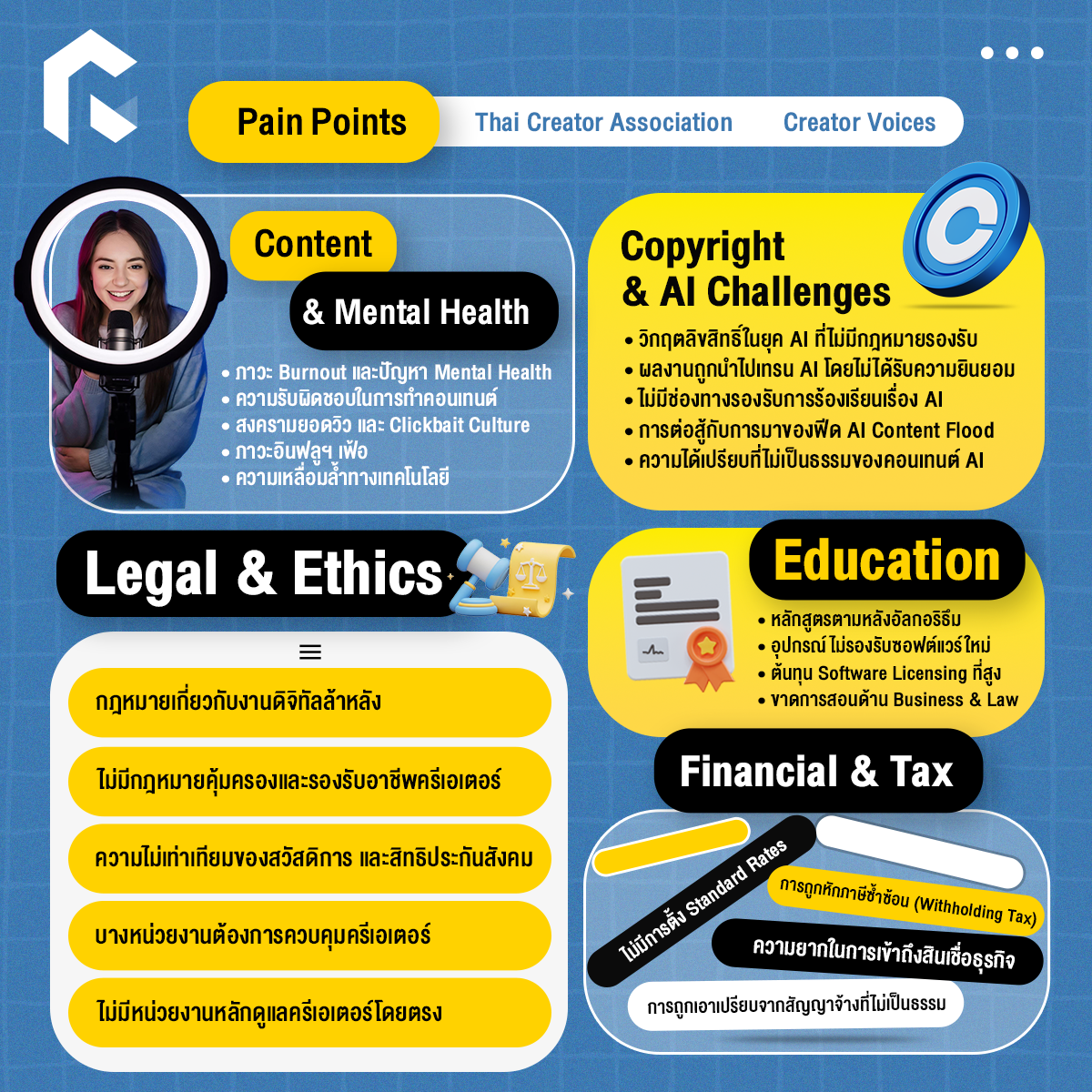 อย่างที่เกริ่นตอนแรกว่า วงการครีเอเตอร์ที่โตขึ้นก็มาพร้อมกับปัญหาในวงการที่มากขึ้น นอกจากเรื่องกฎหมายและลิขสิทธิ์, ผลกระทบจาก AI, การเข้าถึงสินเชื่อธุรกิจ และจริยธรรมในการทำคอนเทนต์แล้ว ยังมีปัญหาอีกมากมายนับไม่ถ้วนที่รอรับการแก้ไข โดยเราแบ่งปัญหาเหล่านี้ออกเป็น 5 หมวดหลัก ได้แก่