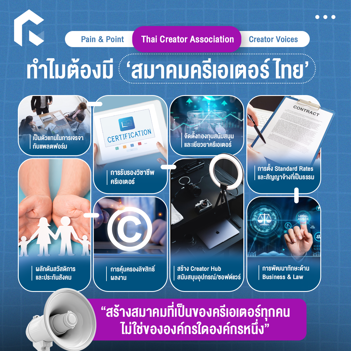 แต่สมาคมครีเอเตอร์ไทยจะเป็นจิ๊กซอว์ชิ้นสำคัญที่สร้างมาเพื่อมอบโอกาส ความมั่นคง และสิทธิประโยชน์ต่าง ๆ อีกทั้งช่วยแก้ปัญหาและพาทุกคนไปสู่ทางรอด พร้อมยกระดับสู่อนาคตของ Creator Community ที่ดีกว่า ผ่านการรับรองวิชาชีพครีเอเตอร์ให้บรรจุในกฎหมาย พร้อมผลักดันสวัสดิการต่าง ๆ, การเป็นตัวแทนครีเอเตอร์ในการเจรจานโยบายกับภาครัฐ หรือหน่วยงานต่าง ๆ ที่เกี่ยวข้อง รวมถึงแพลตฟอร์ม