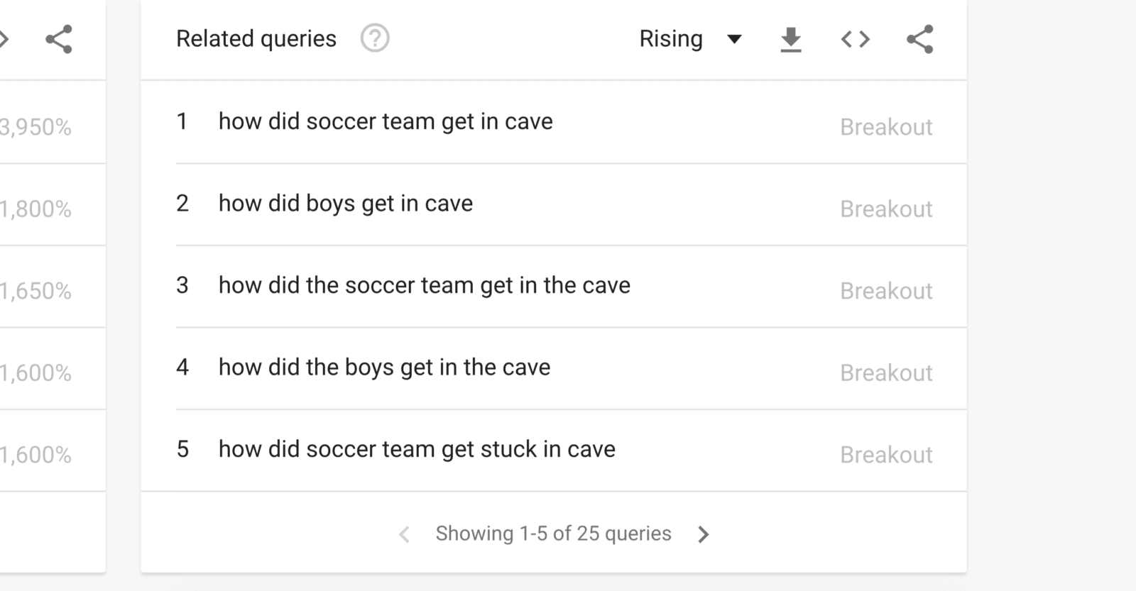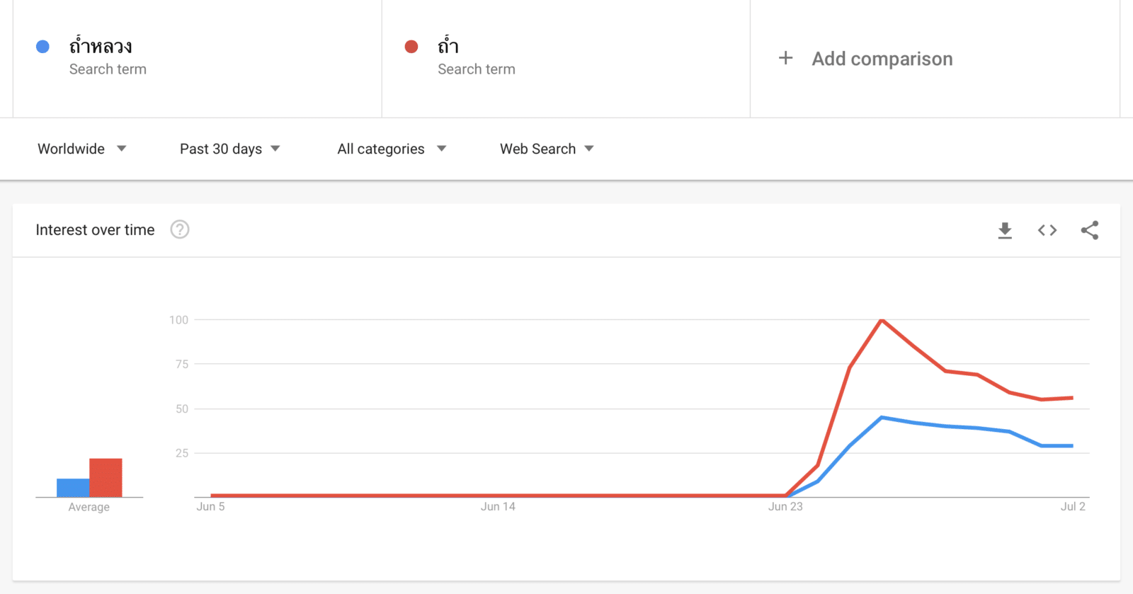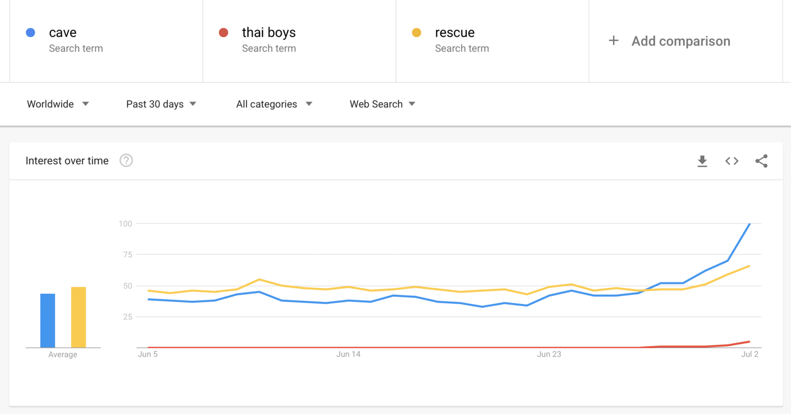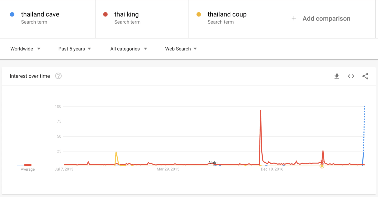 หลังจากที่ได้ลองดูจากกราฟ จะเห็นว่ากรณีเด็กติดถ้ำ มีผลการค้นหาสูงเทียบเท่ากับกรณีการเกิดรัฐประหารในปี 2014 เลยทีเดียว และมากพอ ๆ กับข่าวงานถวายพระเพลิงพระบรมศพของในหลวงรัชกาลที่ 9 แต่ก็ยังไม่เป็นกระแสโลกสูงเท่ากรณีการสวรรคตเมื่อปี 2016