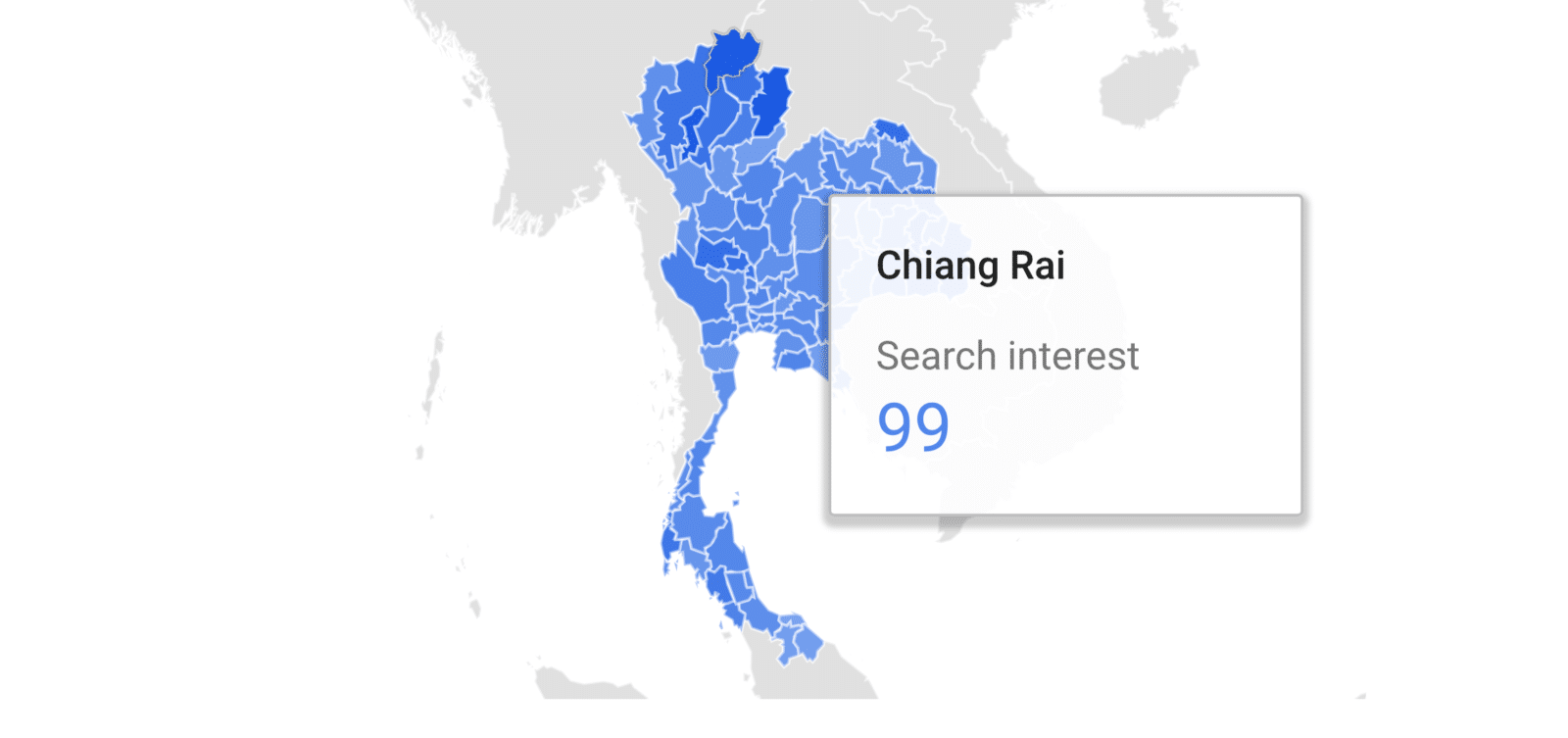 อีกหนึงสิ่งที่น่าสนใจก็คือจาก Heatmap ของ Google Trend บอกว่าจังหวัดเชียงรายมียอดการค้นหาในกรณีนี้สูงมาก และการค้นหาในภาคเหนือก็มีมากกว่าในภาคกลางด้วย