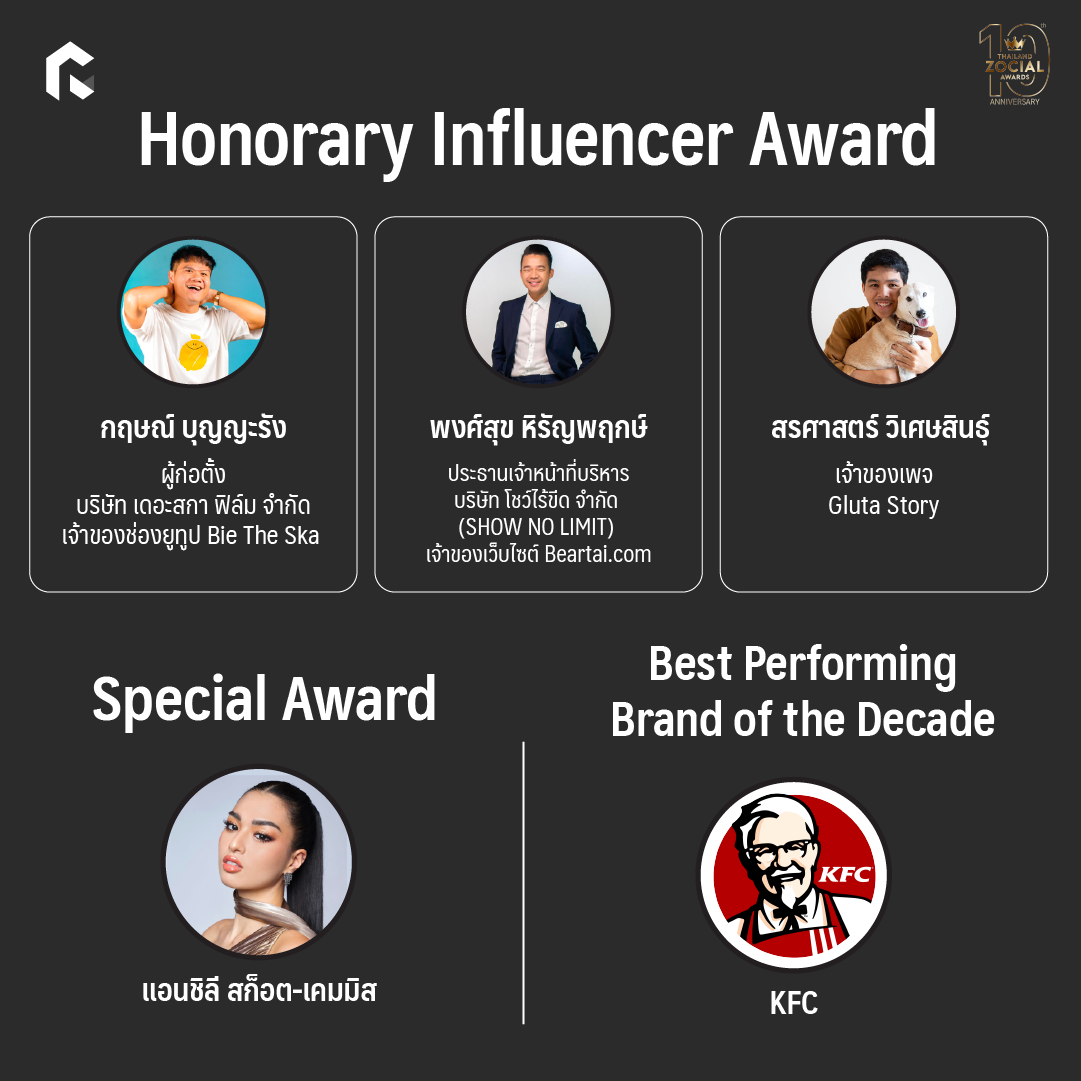 รางวัลไฮไลท์เนื่องในโอกาสฉลองครบรอบการเดินทางเข้าสู่ปีที่ 10 ของ THAILAND ZOCIAL AWARDS ที่มอบให้กับแบรนด์ที่ทำผลงานโดดเด่นบนโซเชียลมีเดียตลอดระยะเวลา 10 ปีที่ผ่านมา – KFC
