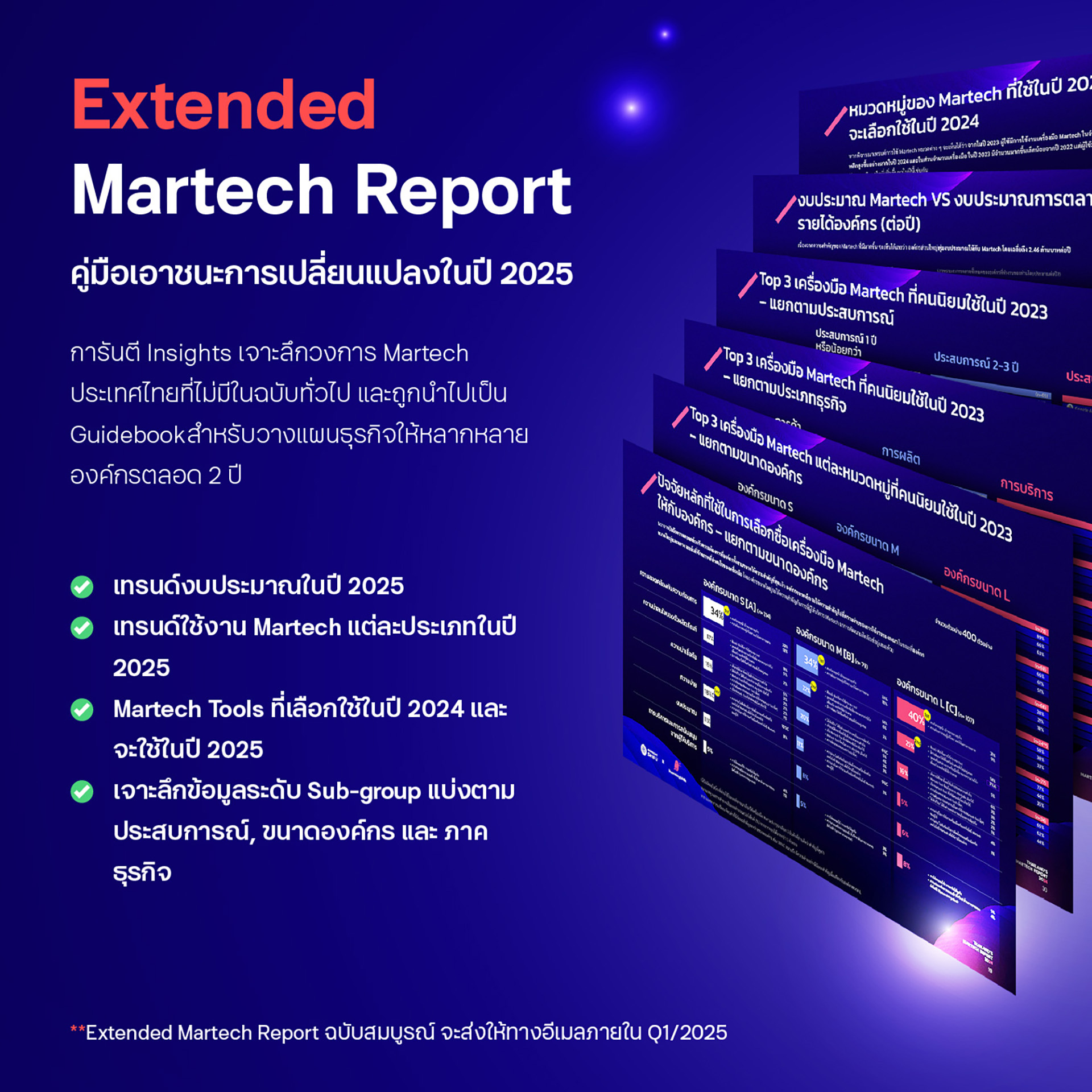 ร่วมเป็นหนึ่งในคนที่ได้ข้อมูลเจาะลึกยิ่งกว่าใคร! สำหรับผู้ร่วมตอบแบบสอบถามเท่านั้น ซึ่งเนื้อหาสำหรับ Extended Edition จะเป็น Insight ในแวดวงธุรกิจ ทั้งเรื่อง Martech Tools/ Brands ที่บริษัทในประเทศไทยใช้ในปี 2024 และจะใช้ในปี 2025 รวมไปถึงเทรนด์งบประมาณ รวมถึงเทรนด์ใช้งาน Martech แต่ละประเภทในปี 2025