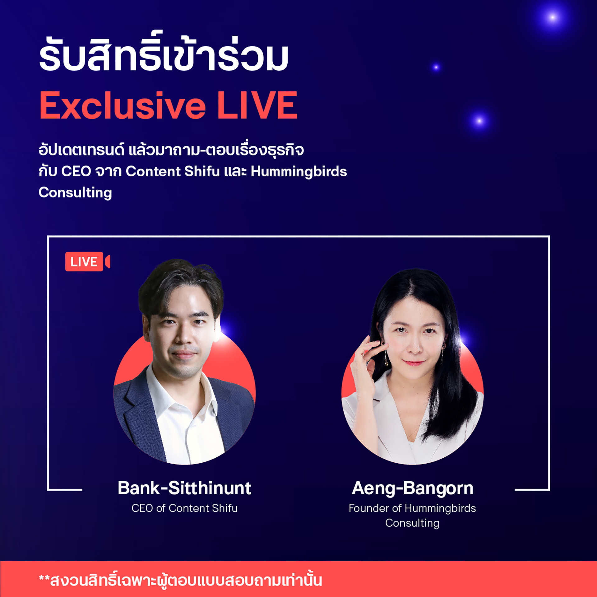 สำหรับผู้ตอบแบบสอบถามรับสิทธิ์เข้าร่วมถาม-ตอบเรื่องธุรกิจผ่าน Exclusive Live Sesion โดยกิจกรรมจะเริ่มหลังการปิดรับแบบสอบถาม และสงวนสิทธิ์สำหรับผู้ตอบแบบสอบถามเท่านั้นซึ่งจะได้พบกับ Speakers ดังนี้