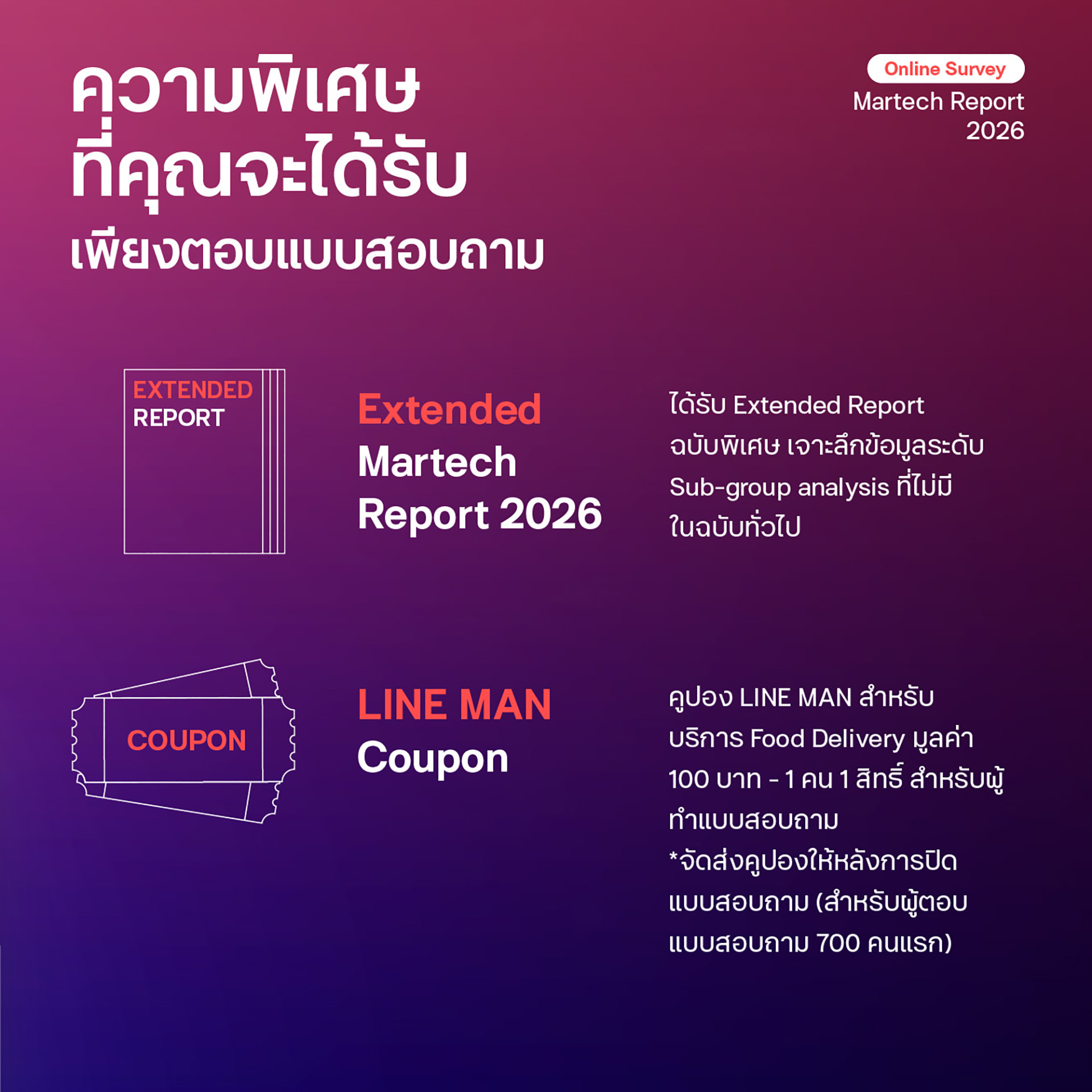 สำหรับ Thailand’s Martech Report 2026 ฉบับทั่วไปจะรวบรวมและวิเคราะห์ Insights จากผู้ตอบแบบสอบถามทั้งฝั่ง MarTech Providers และ MarTech Users ซึ่งจะเผยแพรในช่วง Q1/2026 ส่วนรายงานฉบับ Extended จะมีข้อมูลที่เจาะลึกกว่า ซึ่งเหมาะกับธุรกิจที่ต้องการดูภาพรวมและภาพย่อยของเทรนด์ต่าง ๆ และรายงานเล่มนี้จะแจกให้ดาวน์โหลดเฉพาะคนที่ร่วมตอบแบบสอบถามนี้เท่านั้น