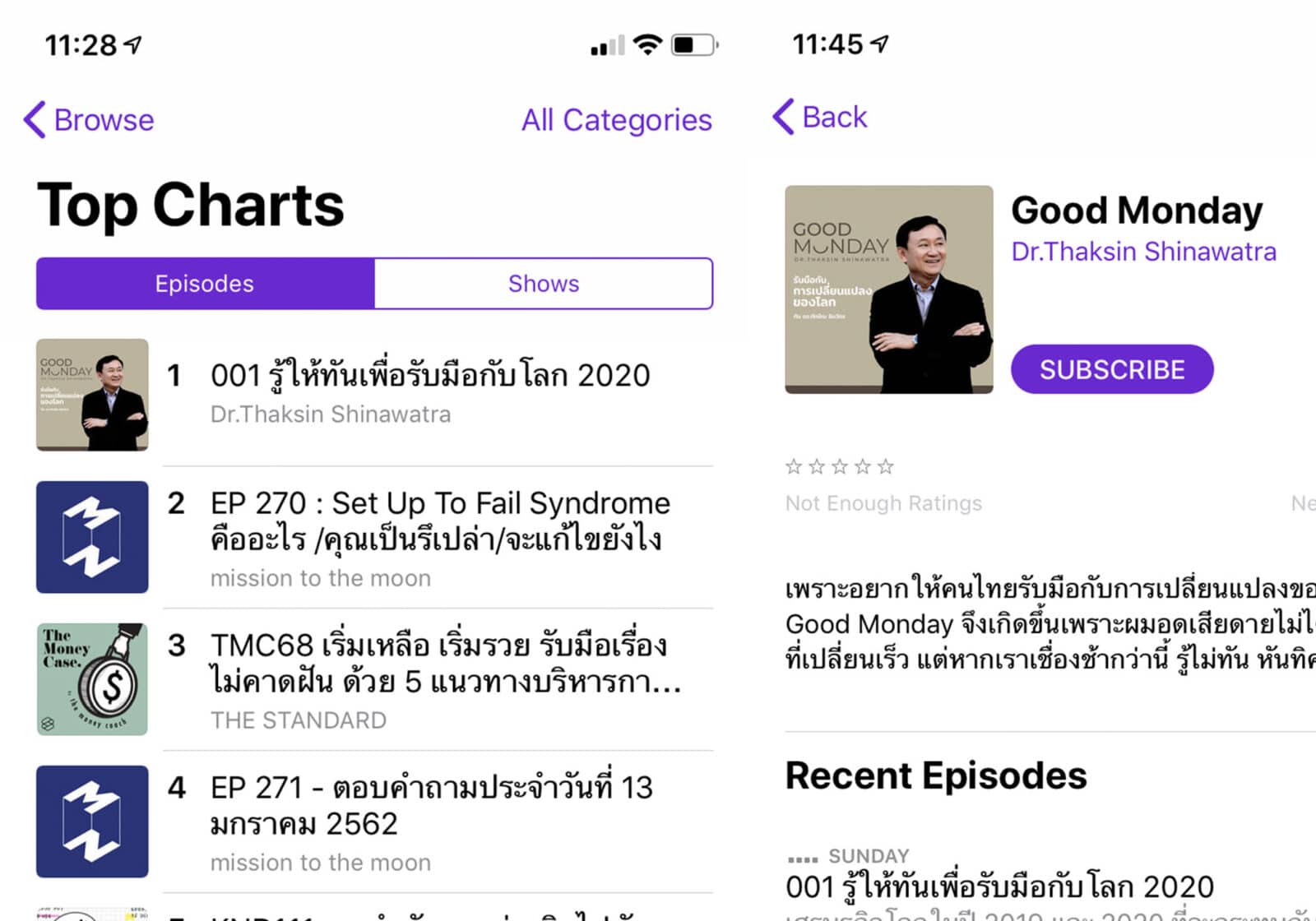 เมื่อพูดถึง Podcast หลายคนอาจจะนึกถึง The Standard, Mission to the Moon หรือในเครือ GetTalks แต่ล่าสุดหลังจากที่อดีตนายก คุณทักษิณ ชินวัตร ได้จัดรายการ Podcast ในชื่อ Good Monday และอัพโหลดขึ้นสู่ช่องทางต่าง ๆ ตั้งแต่บนเว็บไซต์ Thaksin Official หรือบนแอพ Apple Podcast ก็ได้เกิดกระแสมากมาย บ้างก็เอาไปเปรียบเทียบกับรายการคืนความสุขของพลเอกประยุทธ์ จันทร์โอชา รวมถึง ณ ตอนนี้ วันที่ 15 มกราคม Podcast Good Monday ของคุณทักษิณก็ได้กลายเป็น Top Chart บน Apple Podcast ไปแล้ว