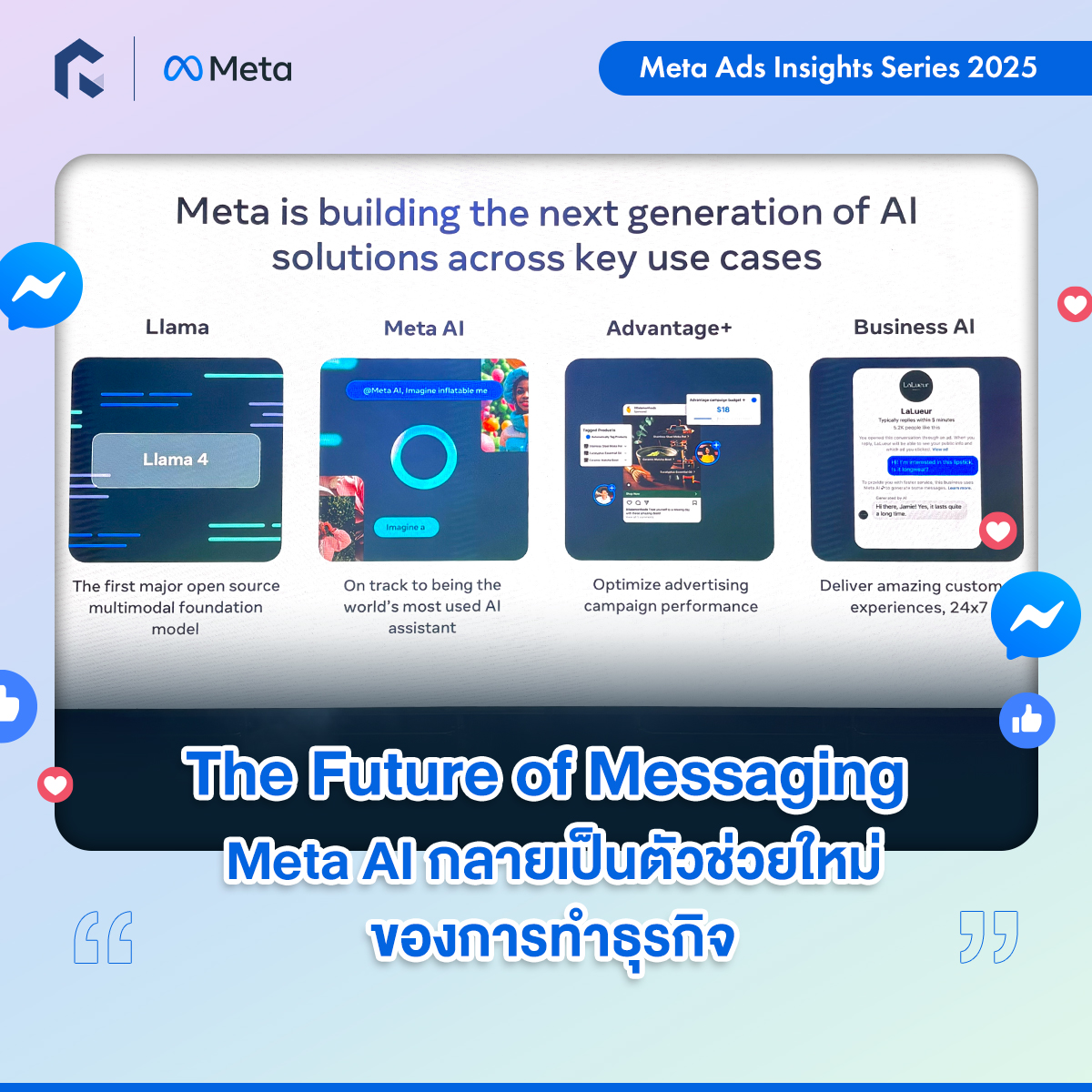 - Meta AI: ถามตอบที่รองรับภาษาไทย มีบนแพลตฟอร์ม Meta ใช้ได้ฟรี สำหรับ Consumer และผู้ประกอบการ