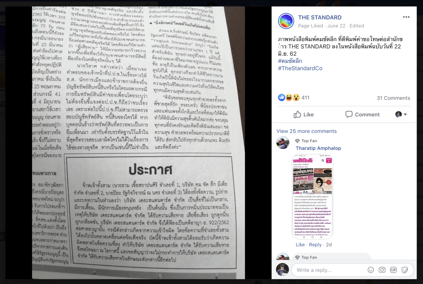 - นายธาม โพสต์ขอโทษ The Standard ลงบน Facebook ส่วนตัว จากการรายงานของ The Standard