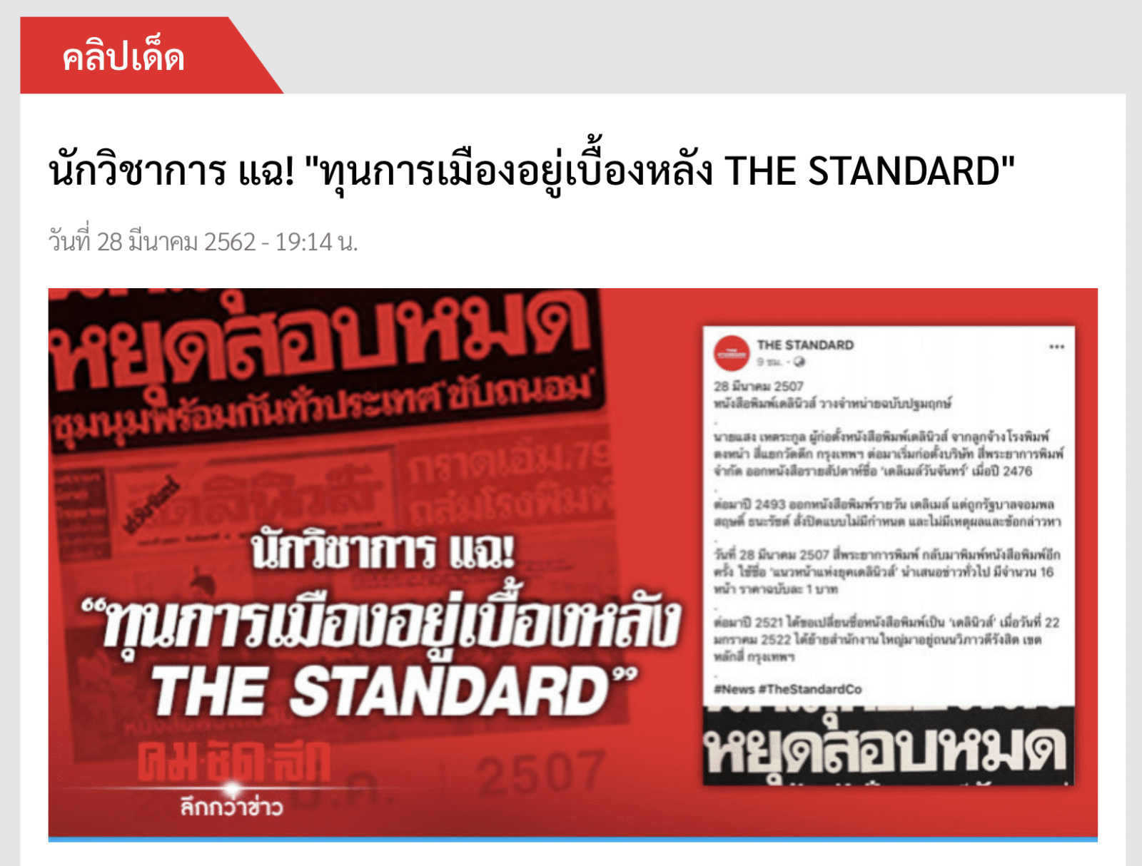 จนสุดท้ายหนังสือพิมพ์คมชัดลึกก็ได้นำประเด็นนี้ไปรายงานในหนังสือพิมพ์หน้าหนึ่งและเว็บไซต์ของสำนักข่าว ในหัวข้อ นักวิชาการ แฉ! “ทุนการเมืองอยู่เบื้องหลัง THE STANDARD”