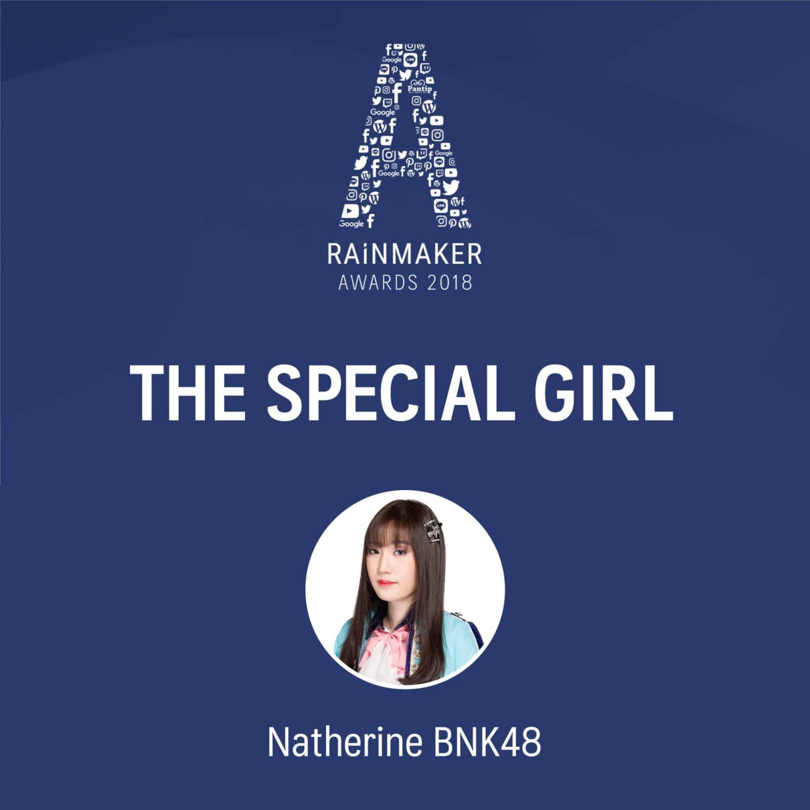 รางวัลพิเศษสำหรับไอดอลที่ใ ช้ Social Network ได้ดีงามและเฉียบจนเราอยากม อบให้ แนทเทอรีน เป็นเด็กสาวคอลูกหนัง ที่มาพร้อมกับตำแหน่งเทพธิด าชาวสวน (แทงสวน) ที่ไม่ได้มาเพราะโชคช่วย เธอเชียร์ทีมไหนทีมนั้นแพ้ห มด ทั้งยังมีอารมณ์ขัน เล่นมุกเก่ง จนบรรดาแอดมินเพจดังเข้ามาเ ล่นด้วยในคอมเมนต์คนละห้าบา ทสิบบาท