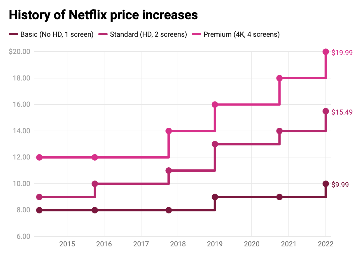 เริ่มที่ Netflix เพราะมีการเปลี่ยนแปลงมากที่สุด จากเดิมในปี 2011 ราคาสมัครสมาชิกอยู่ที่ประมาณ 300 บาทต่อเดือน จากนั้นก็มีการรับชมแบบพรีเมียม 4K อยู่ที่ประมาณ 400 บาทต่อเดือนในปี 2013 และกระโดดมาเป็น 500 บาทต่อเดือนแล้ว