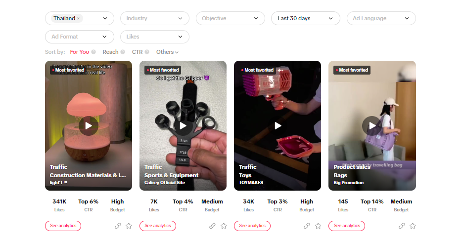 พร้อมคัดกรองเลือกประเทศที่อยากเช็กโฆษณา เอ็นเกจเมนต์ทั้งจากหน้าฟีด For You, Reach, 2s View, 6s View, CVR, ยอด Likes และระยะเวลาการแมสของคลิปทั้ง 7 วัน, 30 วัน และ 180 วัน ไปจนถึงความยาวของคลิปก็เลือกได้ และดูการวิเคราะห์คลิปได้หมดเลย!