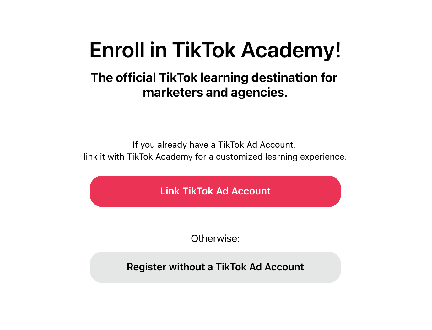 แต่ก่อนที่จะเข้าเรียนหลักสูตรต่าง ๆ ก็ต้อง Log In เข้าใช้งานก่อน โดยสามารถเลือกได้ว่าจะลิงก์กับ Ad Account หรือแค่ TikTok Account เพราะหากลิงก์กับบัญชีที่มีโฆษณาก็จะ Customize หลักสูตรให้เหมาะสมได้มากขึ้น