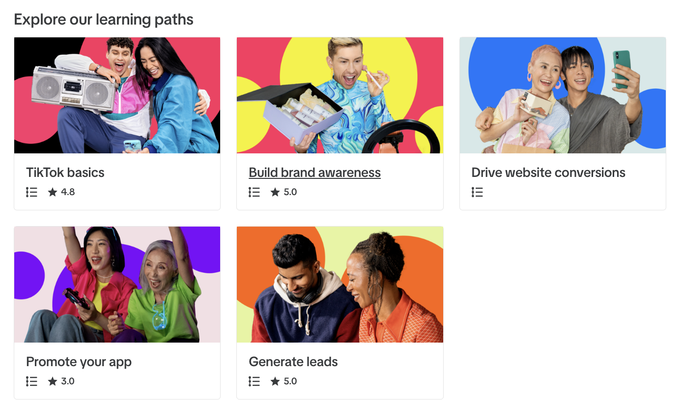 ซึ่งหลักสูตรการศึกษาการตลาดของ TikTok แบ่งออกเป็น 5 กลุ่ม โดยจะเข้าถึงอินไซต์ต่าง ๆ มากขึ้น ทั้ง TikTok Basics, Build brand awareness, Drive website conversions, Promote your app และ Generate Leads ที่ครอบคลุมทุกแง่มุมของการตลาด TikTok
