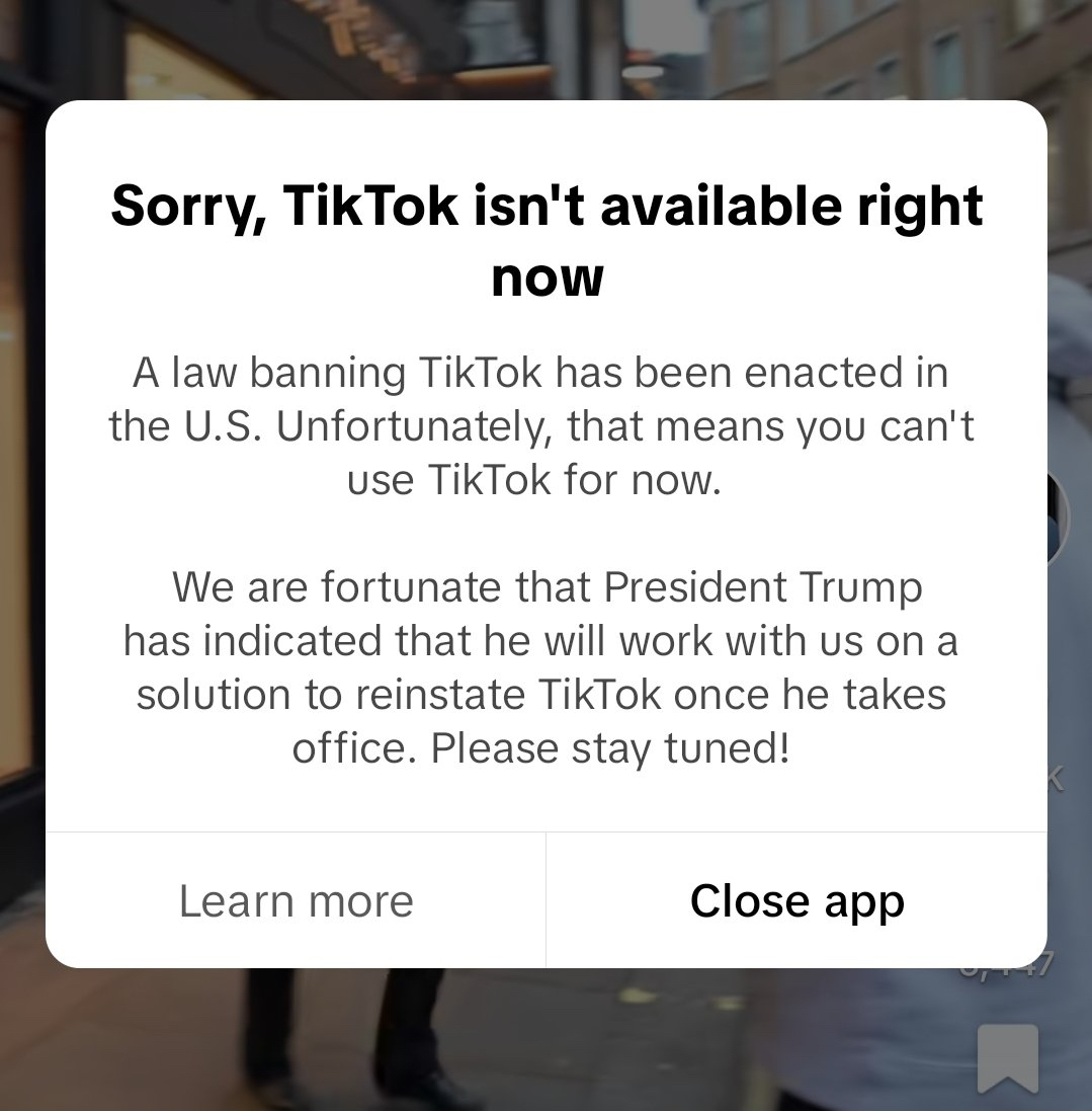 หรือแปลใจความสำคัญได้ว่า “ขออภัย ไม่สามารถใช้งาน TikTok ได้ในขณะนี้ เนื่องจากกฎหมายการแบน TikTok ในสหรัฐฯ แต่โชคดีที่ประธานาธิบดีทรัมป์จะร่วมมือกับเราในการหาทางนำ TikTok กลับมาเมื่อเขาได้เข้ารับตำแหน่ง” เห็นได้ว่า TikTok มีการกล่าวถึงชื่อของทรัมป์อย่างชัดเจนบนแอป ว่าเขาจะให้ความช่วยเหลือเพื่อป้องกัน TikTok จากการโดนแบน