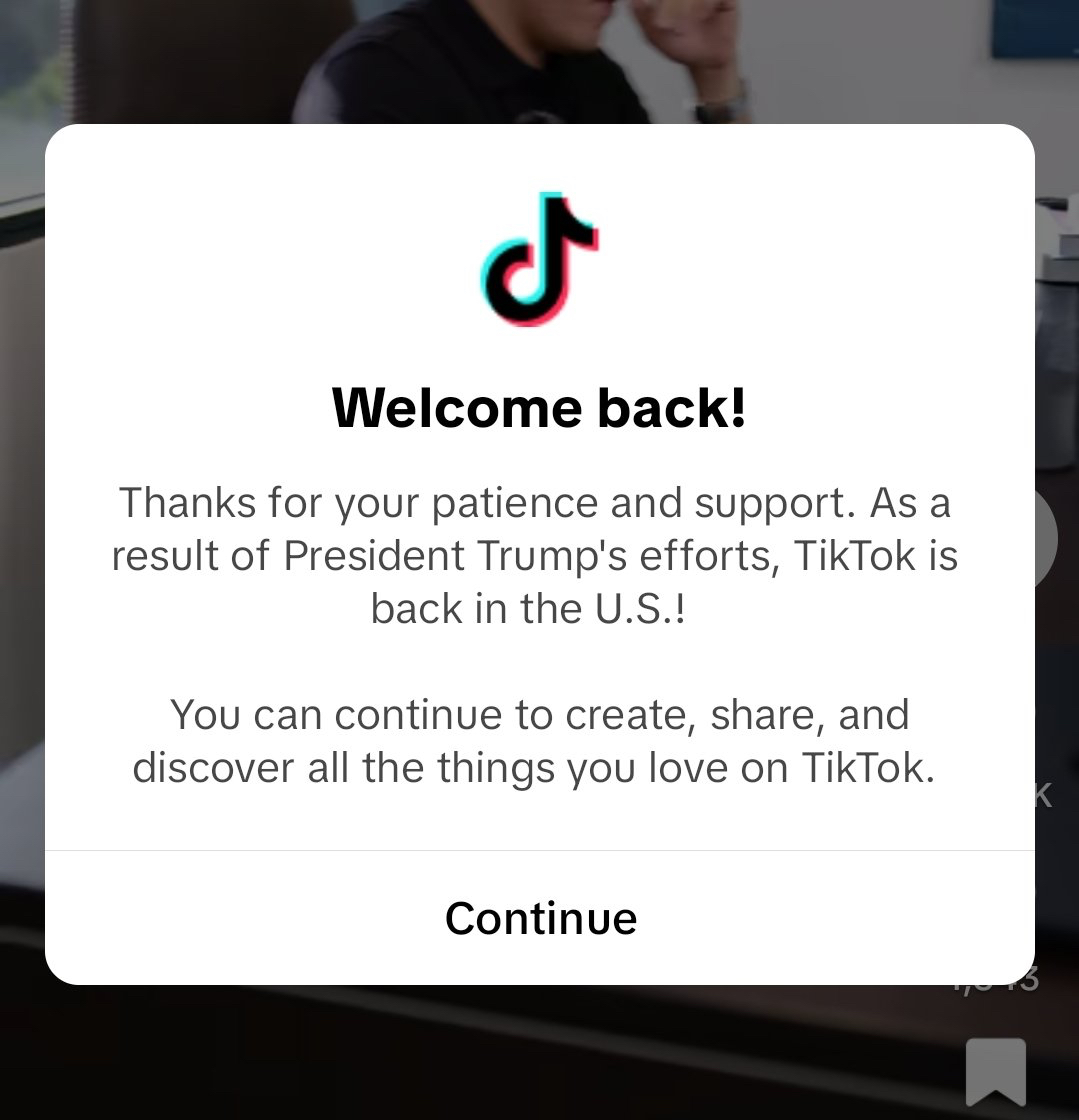 แต่หลังจากผ่านไปราว 20 ชั่วโมง TikTok ก็กลับมาใช้งานได้บางส่วน พร้อมกับมีข้อความป๊อปอัปขึ้นว่า