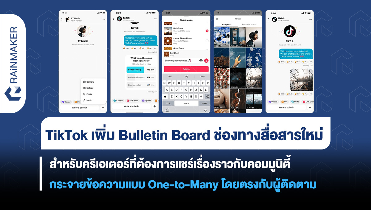 Bulletin Board ฟีเจอร์ใหม่บน TikTok ช่องทางสื่อสารใหม่ภายในแอปที่ช่วยให้ครีเอเตอร์สามารถแชร์คอนเทนต์ เพื่อกระจายข้อความแบบ One-to-Many โดยตรงกับผู้ติดตามเช่นเดียวกับ Broadcast จาก Instagram ทำให้ครีเอเตอร์สามารถโพสต์ข่าวสาร, อัปเดตเรียลไทม์ และสร้างคอมมูนิตี้ที่แข็งแรงบนแพลตฟอร์มได้ง่ายยิ่งขึ้น