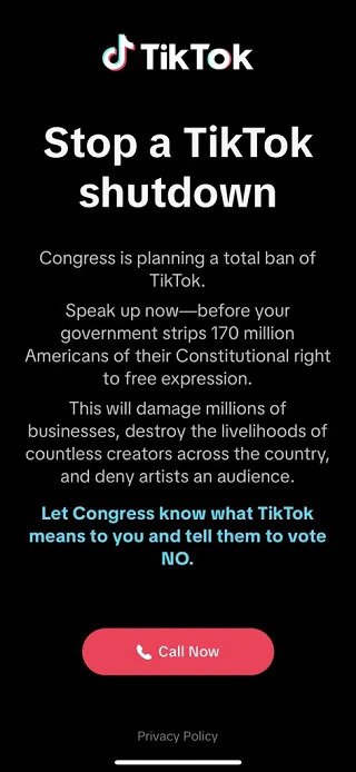 ล่าสุด TikTok เลยออกมาเรียกร้องให้ผู้ใช้ในสหรัฐฯ ลุกขึ้นสู้เพื่อต่อต้านการแบนแอป โดยแสดง Pop-up แจ้งเตือนภายในแอปว่า