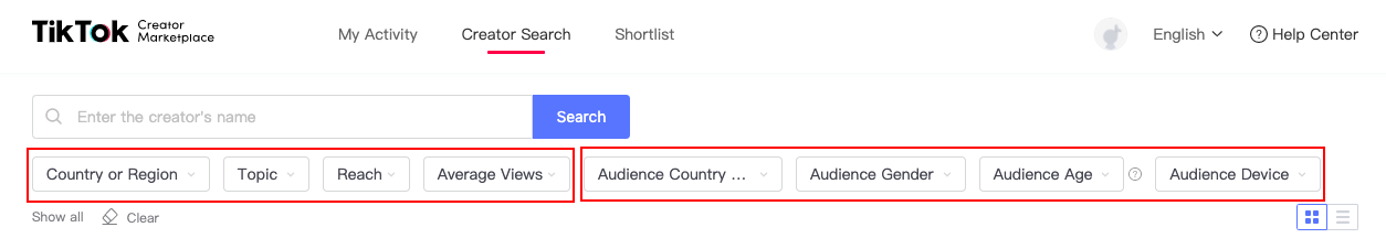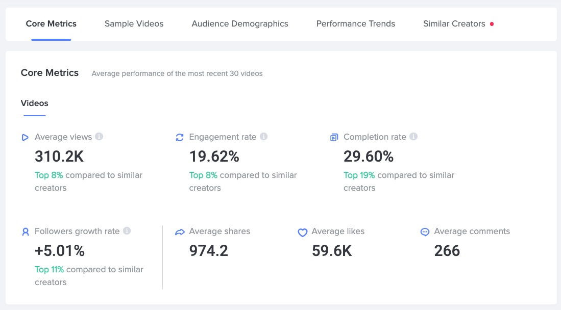 นอกจากชื่อบัญชีของครีเอเตอร์แลัว ยังสามารถค้นหาผ่านการกำหนดการค้นหาต่าง ๆ ไม่ว่าจะเป็น ภูมิภาค, หัวข้อ, ยอด Reach, Average Views, ไปจนถึงประเทศของกลุ่มเป้าหมายได้อีกด้วย โดยข้อมูลอินไซต์เหล่านั้นเจาะลึกลงไปถึง Engagement rate, Followers growth rate และ Average shares/likes/comments เป็นต้น