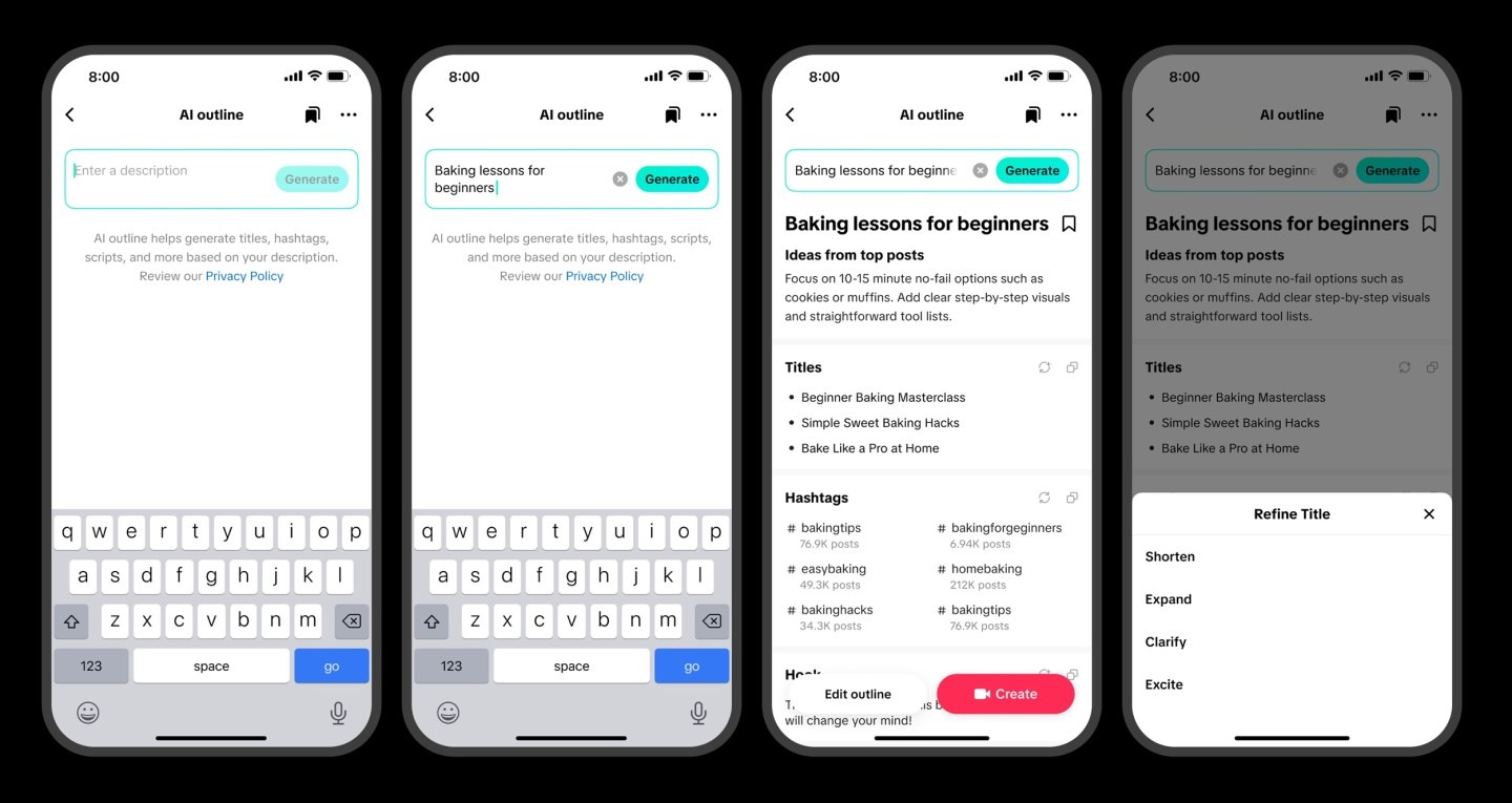 นอกจากนี้ TikTok ยังเปิดตัว AI Outline ที่ออกแบบมาเพื่อครีเอเตอร์ที่ต้องการผู้ช่วยสร้างสรรค์ก่อนที่จะลงมือถ่ายทำคอนเทนต์ด้วยการใช้ AI สร้างโครงร่างจากการป้อนคำสั่ง หรือเลือกจากหัวข้อที่กำลังติดเทรนด์บนแพลตฟอร์ม เช่น ชื่อวิดีโอ, แฮชแท็ก, จุด Hook ผู้ชม และไอเดียสคริปต์ โดยสามารถนำไปปรับให้เข้ากับสไตล์ของเราได้ทันที
