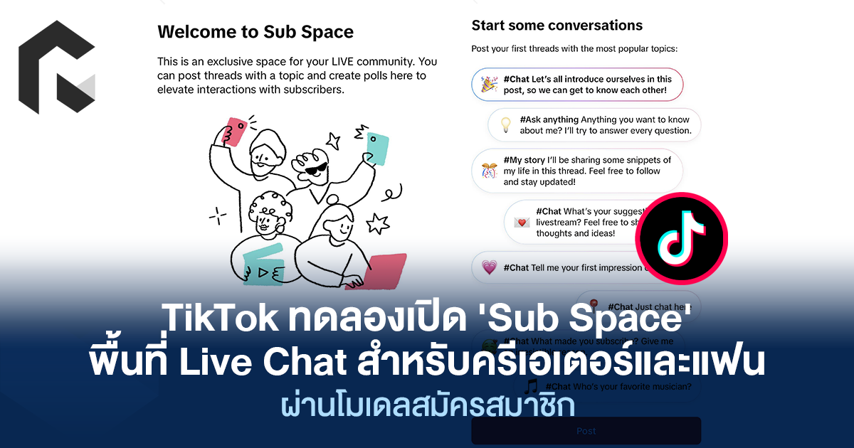 TikTok กำลังทดสอบฟีเจอร์ ‘Sub Space’ ในเครื่องมือ LIVE Subscription ที่จะเป็นพื้นที่ให้ครีเอเตอร์และแฟน ๆ คุยกันผ่านแชตแบบเรียลไทม์ หรือเรียกว่าเป็นห้อง Private Chat สำหรับสมาชิกจ่ายเงินเพื่อเข้าร่วมพื้นที่เอ็กซ์คลูซีฟนี้นั่นเอง