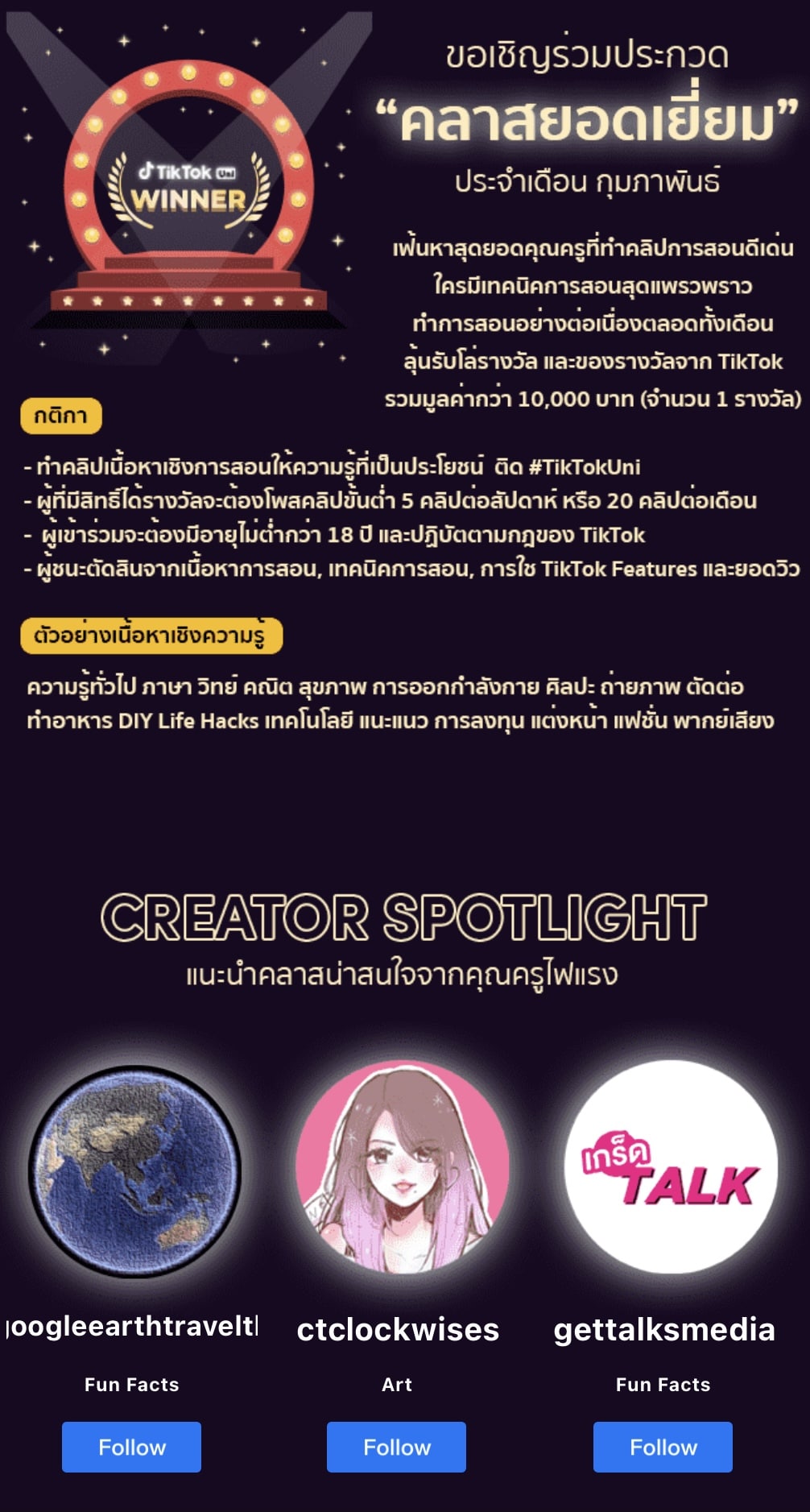 - ตัดสินผู้ชนะจากเนื้อหาการสอน, เทคนิคการสอน, การใช้ฟีเจอร์บน TikTok และยอดวิว