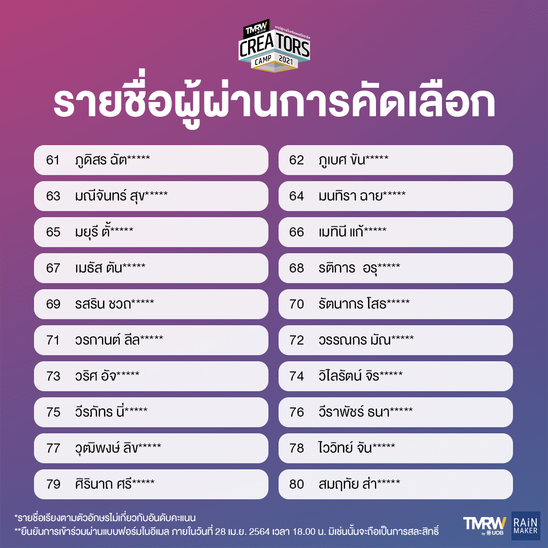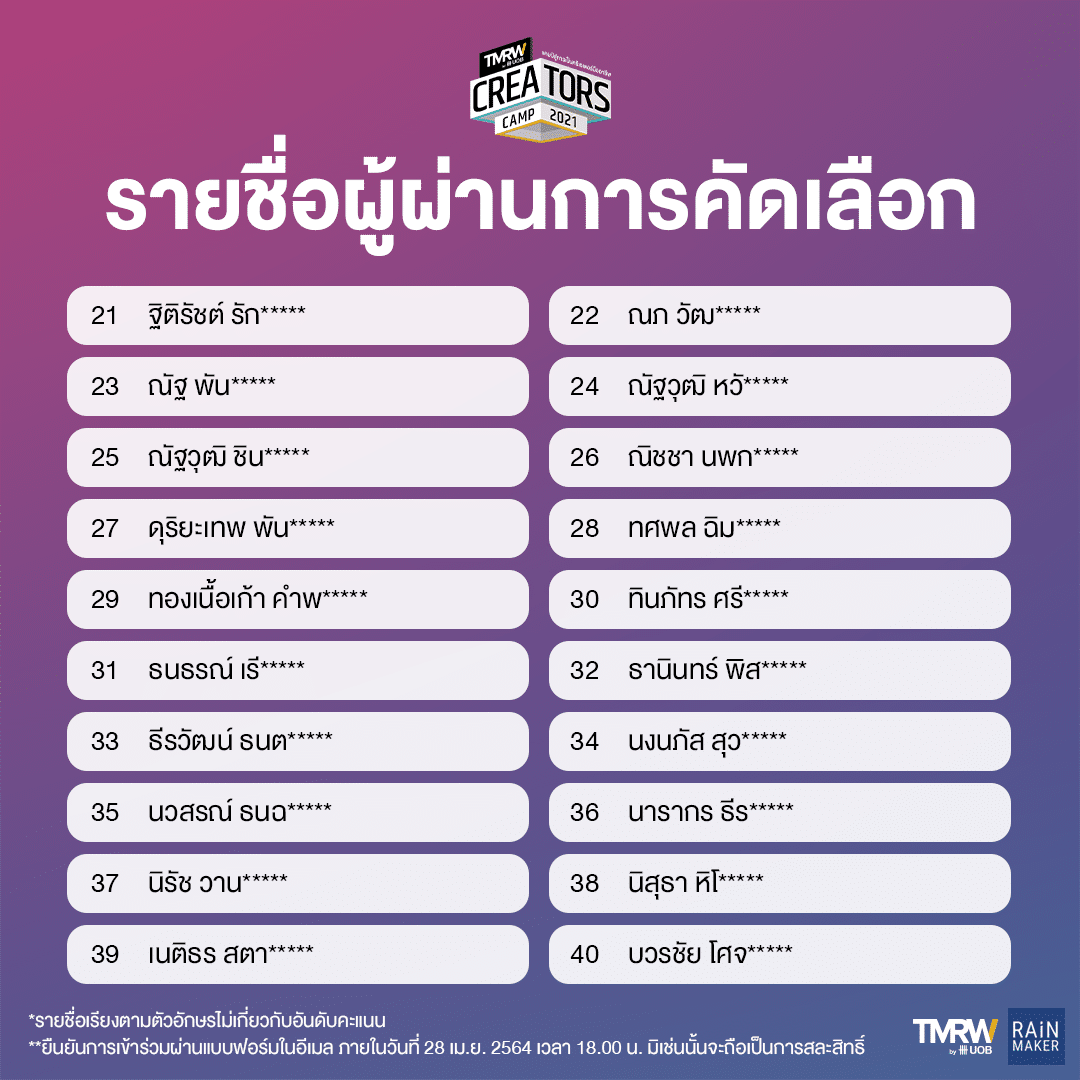 ขอแสดงความยินดีกับผู้ผ่านการคัดเลือกทั้ง 100 คนอีกครั้งนะคะ แล้วเจอกันในแคมป์ค่ะ! ส่วนใครที่ไม่ผ่านเข้ารอบก็ไม่ต้องเสียใจไป ไว้เจอกันใหม่โอกาสหน้า สุดท้ายนี้ขอบคุณทุกคนอีกครั้งที่ให้ความสนใจกับโครงการ TMRW Creators Camp 2021 นะคะ