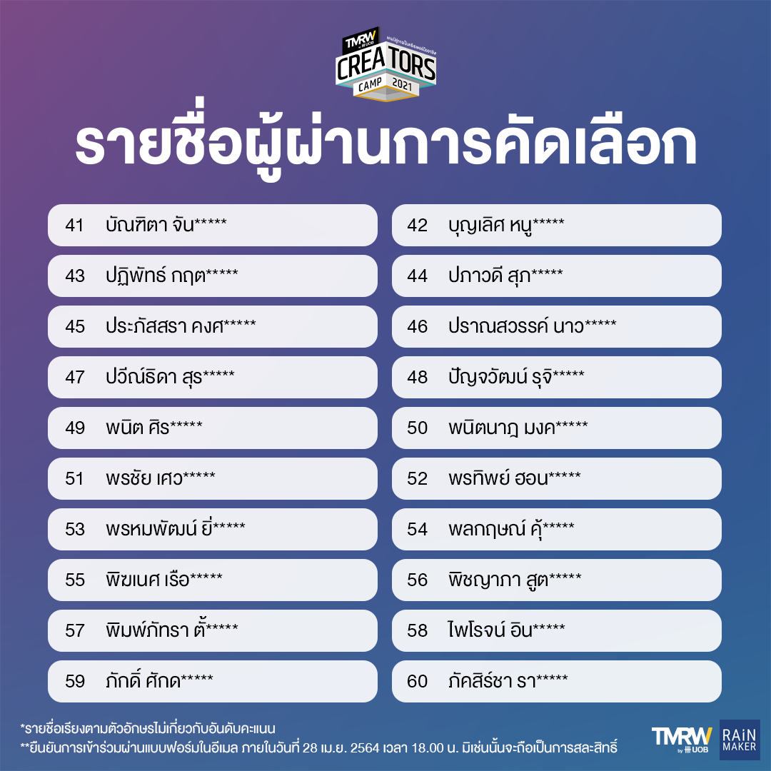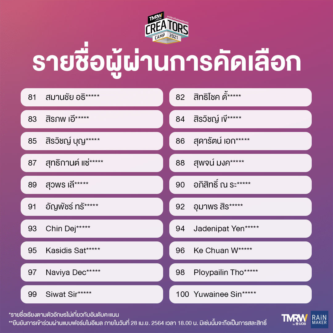 หลังจาก ‘TMRW Creators Camp 2021 แคมป์สู่การเป็นครีเอเตอร์มืออาชีพ’ ได้เปิดรับสมัครจนถึงวันที่ 20 เมษายนที่ผ่านมา วันนี้ก็ถึงเวลาประกาศรายชื่อผู้ผ่านการคัดเลือกเข้าร่วมโครงการทั้ง 100 คนกันแล้ว