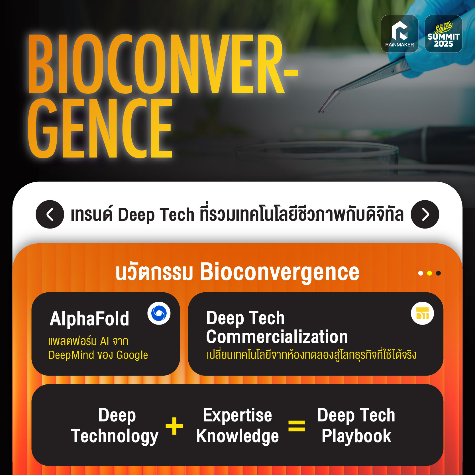 คือ จุดเปลี่ยนเชิงโครงสร้างของโลกธุรกิจที่เทรนด์ Deep Tech เกิดขึ้นมาจากการหลอมรวมเทคโนโลยีชีวภาพกับดิจิทัล ทำให้มีการนำ AI และงานวิจัยในห้องแล็บมากลั่นเป็นสินค้าที่ตอบโจทย์ในตลาดชีวิตจริงได้ เพราะ AI ไม่ได้อยู่แค่ในโลกคอมพิวเตอร์ แต่กลายมาเป็นส่วนหนึ่งในชีวิตประจำวันของผู้คนมากขึ้น