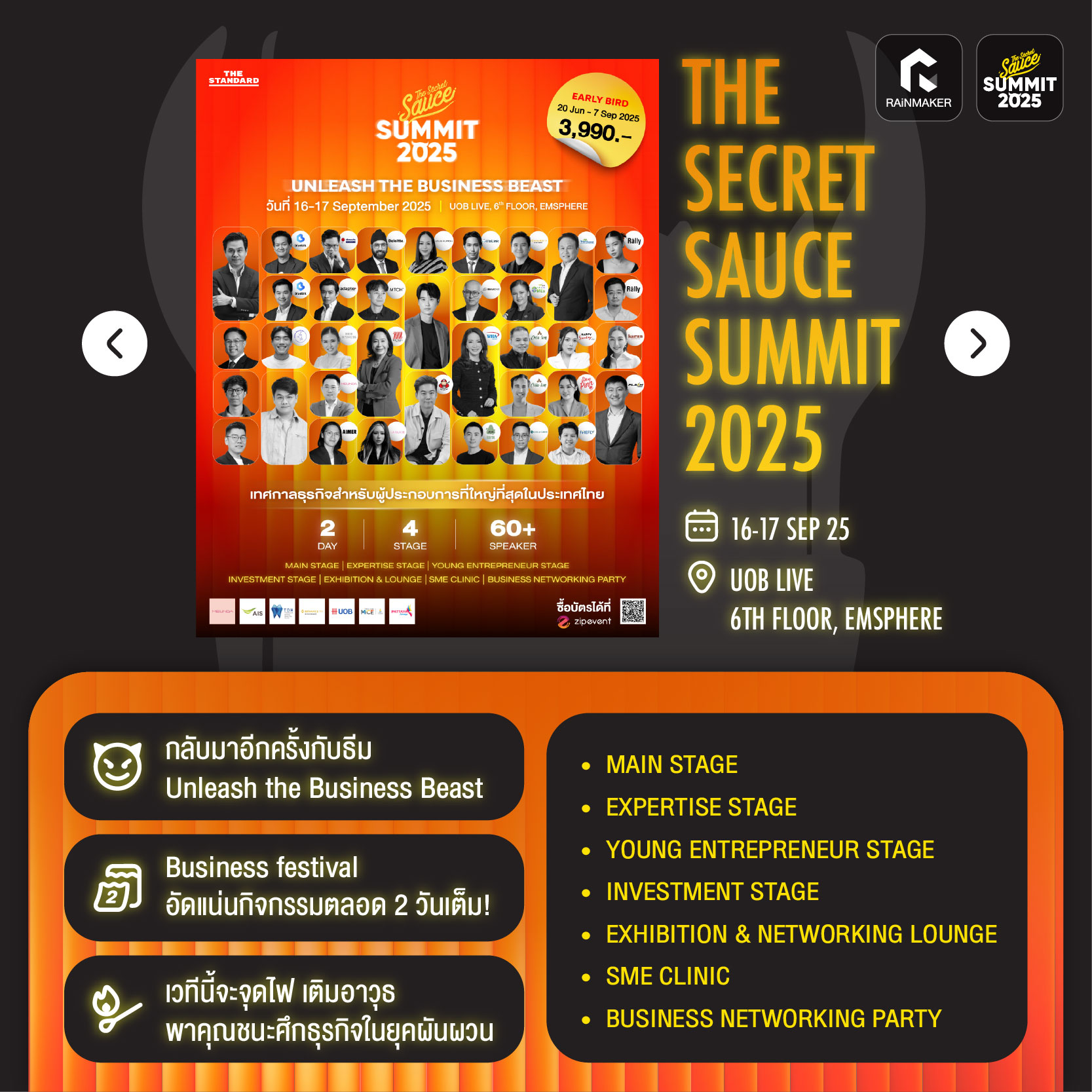งาน The Secret Sauce Summit 2025 กลับมาอีกครั้งกับธีม Unleash the Business Beast เวทีนี้จะจุดไฟ เติมอาวุธ พาคุณชนะศึกธุรกิจในยุคผันผวน และ Business festival อัดแน่นกิจกรรมตลอด 2 วันเต็ม!