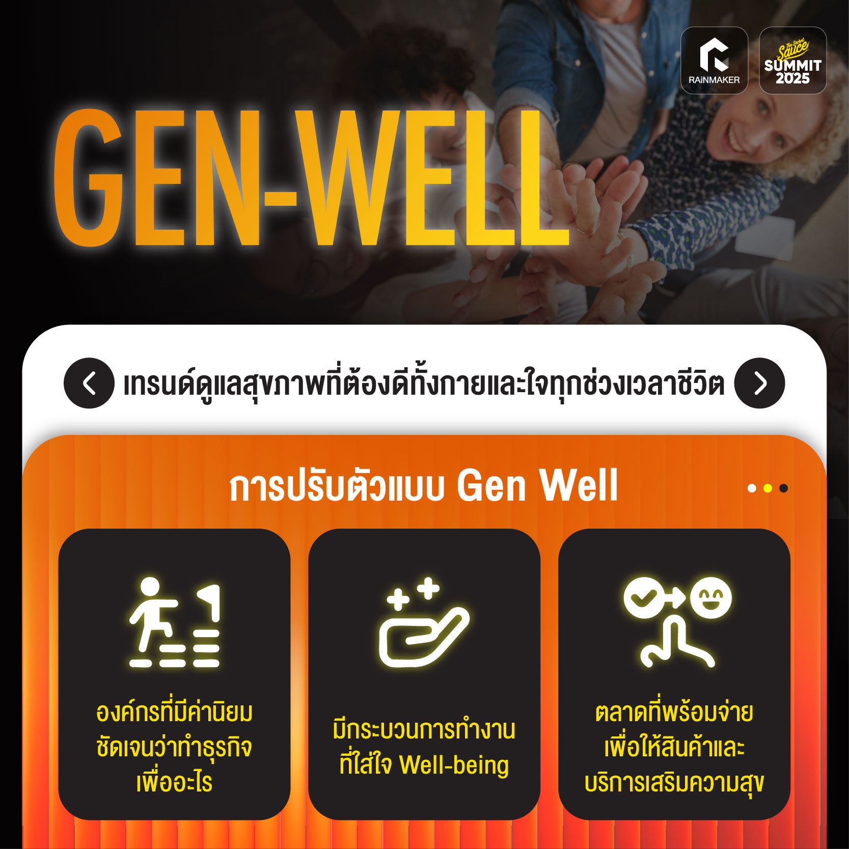 คือ เทรนด์ดูแลสุขภาพที่ต้องดีทั้งกายและใจทุกช่วงเวลาชีวิต ที่คนรุ่นใหม่มองหาความสมบูรณ์ครบทุกมิติชีวิตมากกว่าแค่เรื่องสุขภาพ หลังคนรุ่นใหม่ในไทยกว่า 63% ใช้ชีวิตแบบ ‘เดือนชนเดือน’ ซึ่งสูงกว่าค่าเฉลี่ยโลก การปรับตัวเรื่อง Gen-Well จึงต้องเชื่อมโยงไปถึงวัฒนธรรมองค์กรและกลยุทธ์ทางธุรกิจด้วย