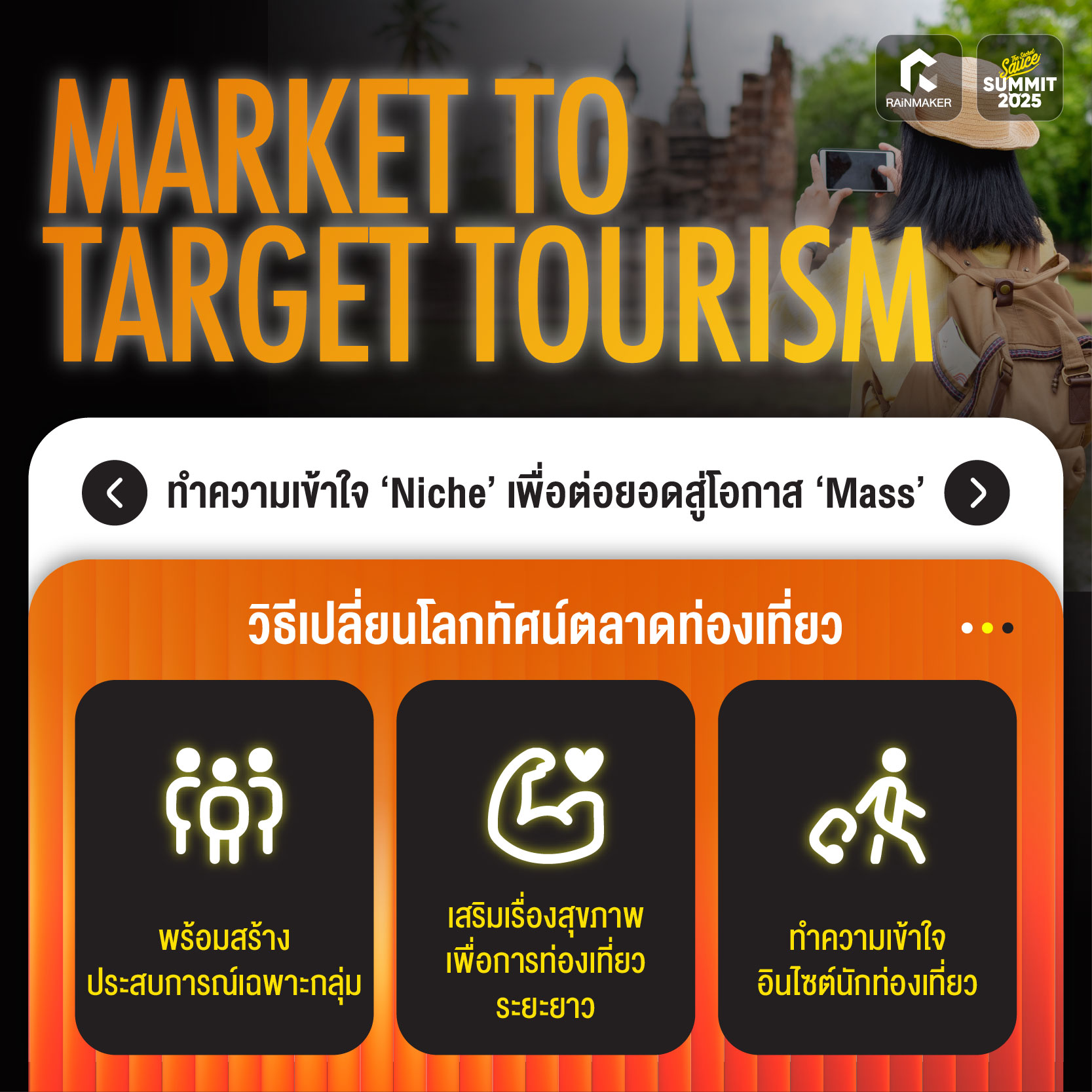 คือ การตลาดท่องเที่ยวที่สร้างประสบการณ์แบบเจาะจงกับกลุ่มเป้าหมาย ผ่านการทำความเข้าใจแบบ ‘Niche’ เพื่อต่อยอดสู่โอกาสในการ ‘Mass’ ได้ง่ายขึ้น โดยเฉพาะในภาคการท่องเที่ยวที่ผู้คนไม่ได้แค่มาพักผ่อนแต่อยากมาพักใจและใช้เวลาของตัวเองให้คุ้มค่า ประสบการณ์ที่ได้รับจึงต้องพิเศษและไม่ใช่แค่การหว่านแห