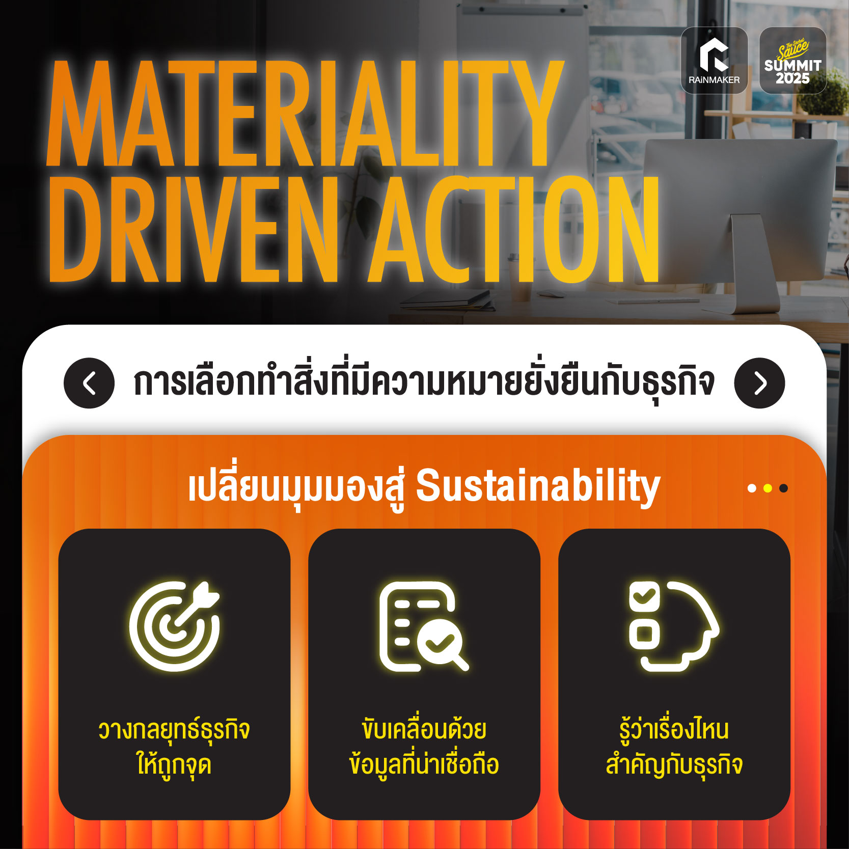 คือ การเลือกทำสิ่งที่มีความหมายยั่งยืนกับธุรกิจ หรือเปลี่ยน ESG ให้กลายเป็นการขับเคลื่อนธุรกิจ เพราะการเป็นผู้ประกอบการในโลกธุรกิจจะต้องรับแรงกดดันทั้งจากฝั่งลูกค้าและพาร์ทเนอร์อยู่ตลอดเวลา การมีกลยุทธ์เพื่อมุ่งไปถึงจุดสำคัญของธุรกิจก็จะช่วยให้เป้าหมายสำเร็จได้มากขึ้น