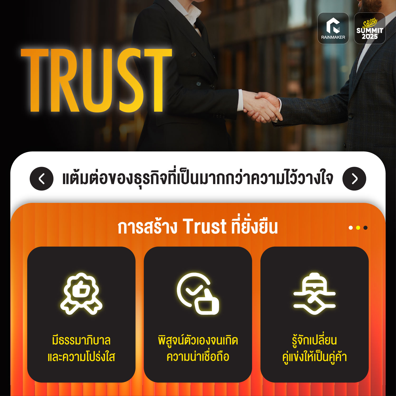 คือ การสร้างความเชื่อใจกับทุกภาคส่วนในธุรกิจ เสมือนแต้มต่อของธุรกิจที่เป็นมากกว่าความไว้วางใจ เพราะในยุคที่ข้อมูลข่าวสารและเทรนด์ต่างมาไวและไปไว หรือไม่ว่าเทคโนโลยีจะก้าวหน้าไปมากแค่ไหนโมเดลการทำธุรกิจก็ขาดความไว้วางใจไม่ได้