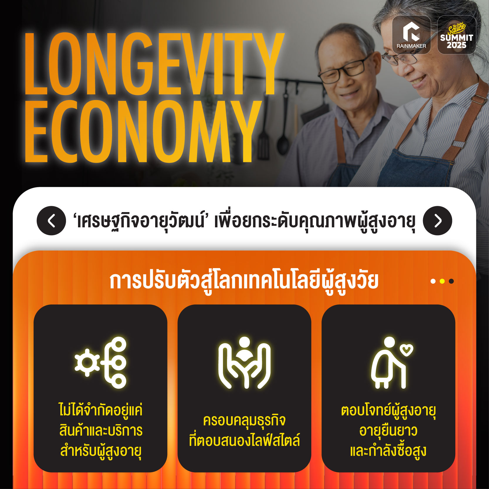 - ตอบโจทย์ผู้สูงอายุอายุยืนยาวและกำลังซื้อสูง: ทั้งสินค้าและบริการที่ตอบโจทย์ จะต้องตอบโจทย์การใช้ชีวิตในระยะยาวมากขึ้น ทั้งในด้านสุขภาพกายและสุขภาพใจ
