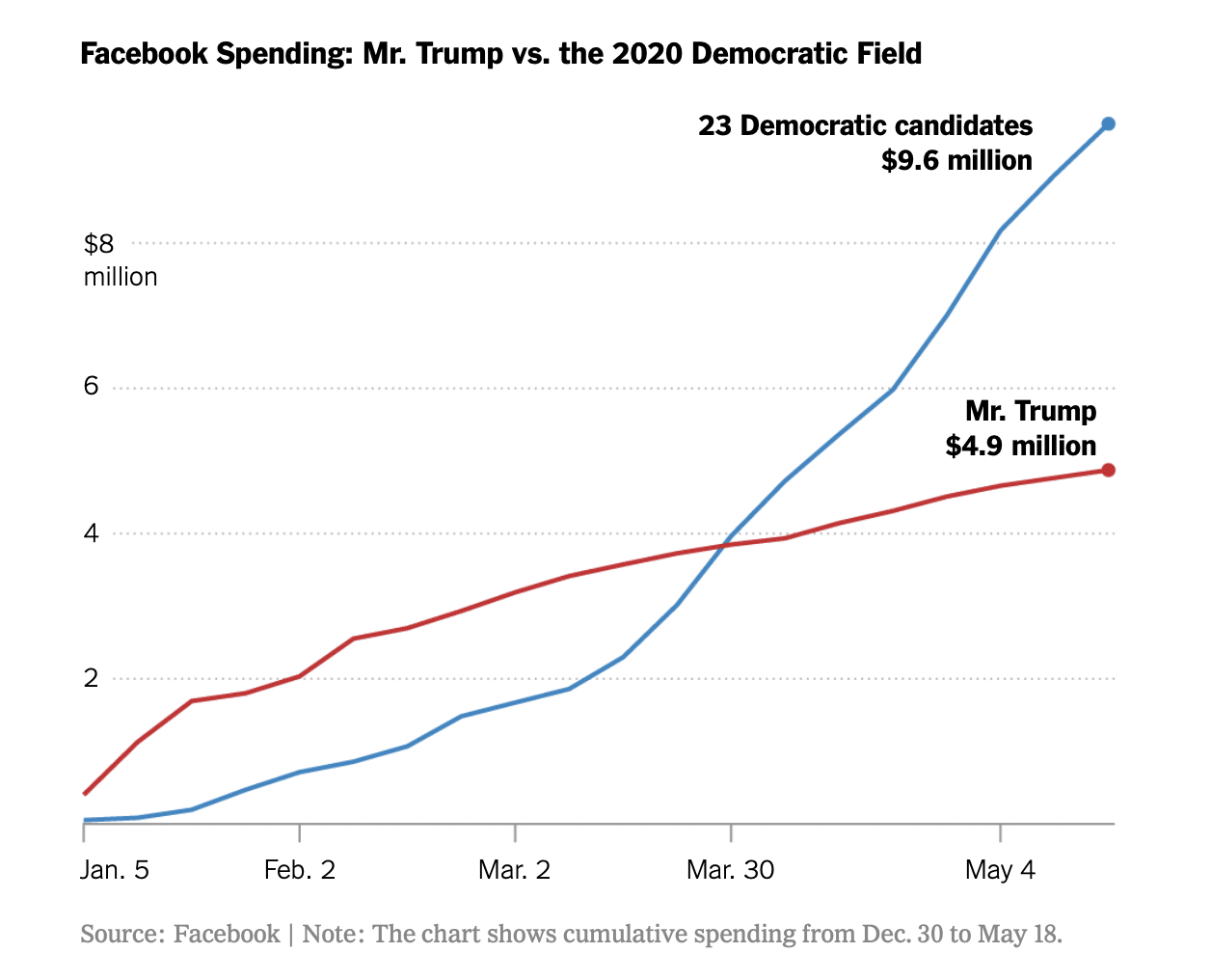เว็บไซต์ The New York Times ได้ลงบทความชื่อว่า How Trump Is Outspending Every 2020 Democrat on Facebook ซึ่งเป็นการพูดถึงเม็ดเงินที่พรรค Democrat ลงไปกับ Facebook เทียบกับ Donald Trump คนเดียว ไม่นับรวมสมาชิกพรรค Republican แล้วบอกว่าคนที่ใช้เงินในการบูสโพสต์มากที่สุดนั้นไม่ใช่ใครแต่เป็นประธานาธิบดี Donald Trump นั่นเอง