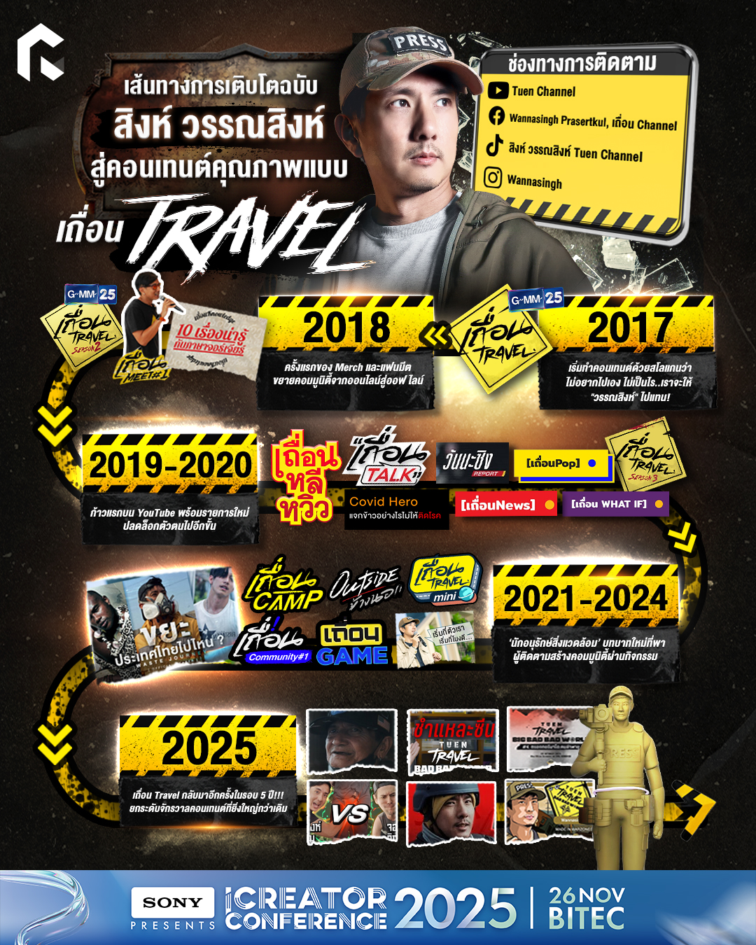 และถ้าอยากเรียนรู้เทคนิคการารเล่าเรื่องที่ดีจะสร้างคุณค่าให้คอนเทนต์ของเราได้อย่างไร ก็มาเจอกับสิงห์ – วรรณสิงห์ ประเสริฐกุลได้ที่ iCreator Conference 2025 Presented by Sony ใน Session: The Story That Matter สร้างคุณค่าผ่านคอนเทนต์ถ่ายทอดเรื่องจริงแบบ ‘เถื่อน Travel Bad Bad World’ ซื้อบัตรได้ที่ Eventpop เลย!