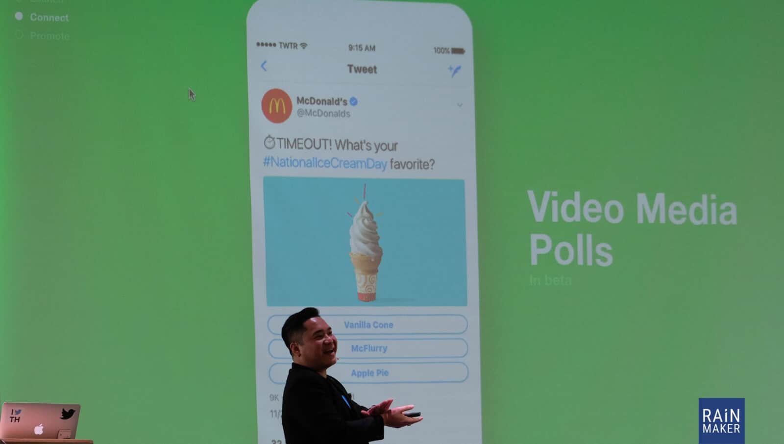 - Video Media Poll ฟีเจอร์โพลนั้นเป็นความสามารถทั่วไปของทวิตเตอร์อยู่แล้ว แต่สิ่งที่เพิ่มขึ้นมาคือแบรนด์จะสามารถใส่วิดีโอ แล้วให้มี Poll ขึ้นอยู่ด้านล่างวิดีโอนั้นได้