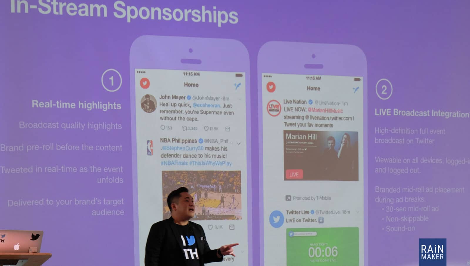 - In-stream sponsorship ช่วงหลังนี้ทวิตเตอร์หันมาเปิดให้มีการ Live หรือถ่ายทอดสดมากขึ้นโดยเฉพาะการแข่งขันกีฬาสำหรับฟีเจอร์นี้แบรนด์จะสามารถซื้อโฆษณาช่วงก่อนที่คนจะกดดู Live และเล่น Pre-roll Video สั้น ๆ ไม่กี่วินาทีเท่านั้นก่อนที่ Live จะเริ่มเล่น (คล้ายกับการตัดเข้าการแข่งขันสดเวลาชมในทีวี) ซึ่งนับว่ายังไม่มีโซเชียลไหนนำมาก่อน ทั้ง Facebook และ YouTube