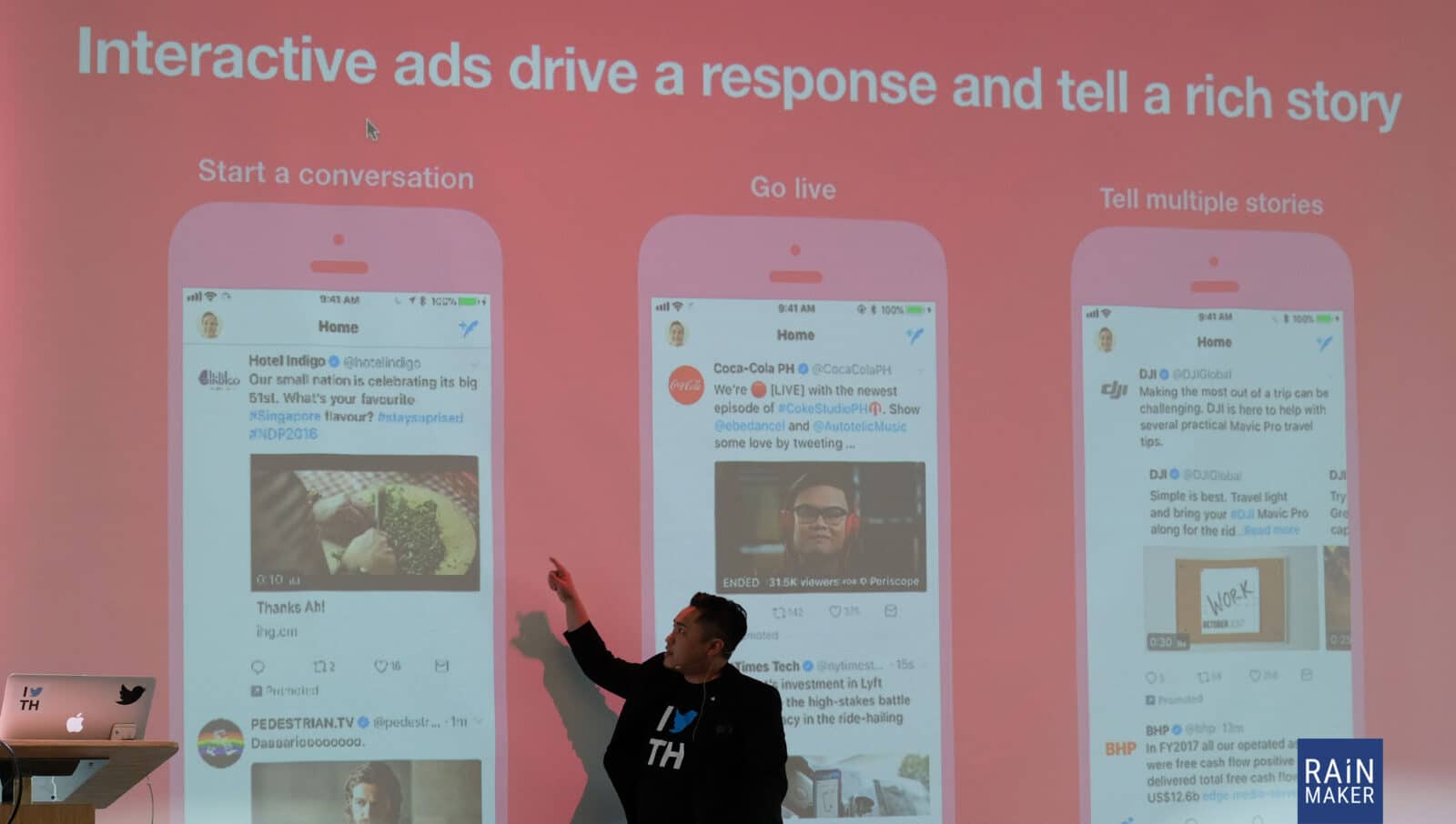 - Interactive Ads แทนที่จะทำการทวีตหรือลงรูปภาพธรรมดา แบรนด์สามารถเพิ่มตัวเลือกเป็นปุ่ม Action ได้ เช่น ให้ทวีตเกี่ยวกับแคมเปญนี้ผ่าน Hashtag
