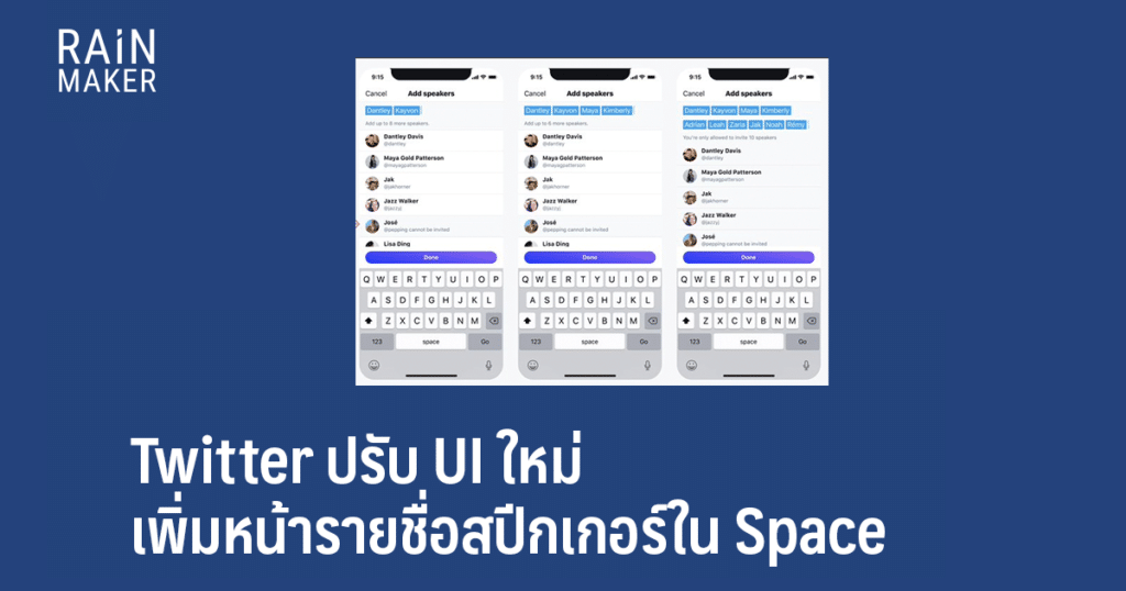 ยังคงมาแรงอย่างต่อเนื่องสำหรับสาย Audio เมื่อทวิตเตอร์เปิดตัวการปรับปรุง UI ใหม่ในส่วนของ Spaces ด้วยการแสดงรายชื่อสปีคเกอร์ที่ด้านบนของสกรีน พร้อมปุ่ม “เพิ่มสปีคเกอร์” และยังมีการอัปเดตชื่อผู้ที่ถูกเพิ่มไปแล้วก่อนหน้า ซึ่งในขณะนี้ทวิตเตอร์สามารถเพิ่มคนได้สูงสุด 11 คน (รวมโฮสต์ด้วย)