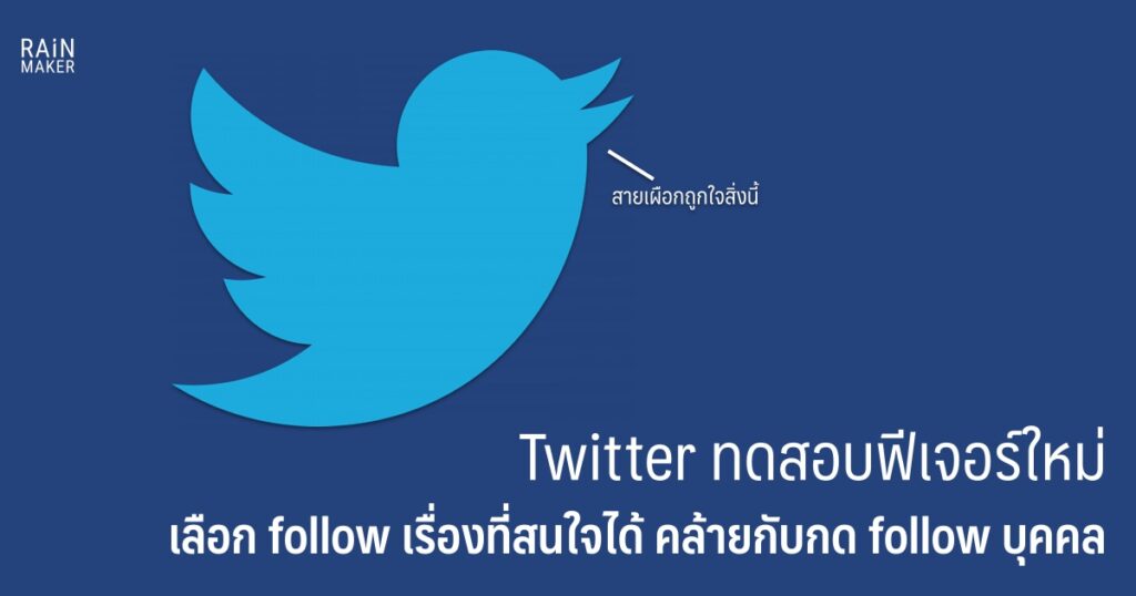 Twitter กำลังทดสอบฟีเจอร์ใหม่ที่น่าสนใจ คือให้ผู้ใช้สามารถกด follow เรื่องราวที่สนใจ คล้ายกับการกด follow บุคคล สามารถเลือกกดติดตามหัวข้อต่างๆ ตั้งแต่ทีมกีฬาที่ชื่นชอบ, คนดัง, รายการทีวีที่ชอบ, หรือเรื่องที่กำลังเป็นกระแส