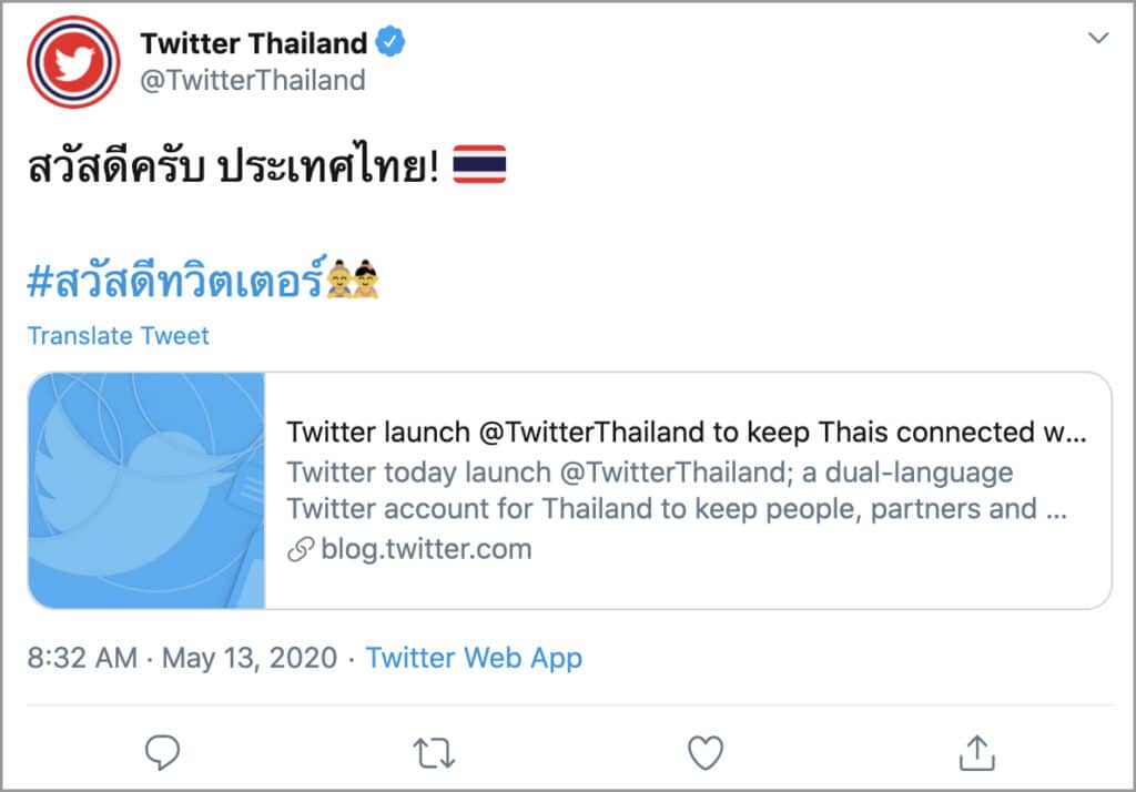ทวิตเตอร์ประกาศเปิดตัวแอคเคาท์ไทยอย่างเป็นทางการ โดยใช้ชื่อว่า @TwitterThailand เพื่อให้คนไทยได้เชื่อมโยงและติดตามสิ่งที่กำลังเกิดขึ้น ไม่พลาดทุกเหตุการณ์ทั่วโลก #WhatsHappening