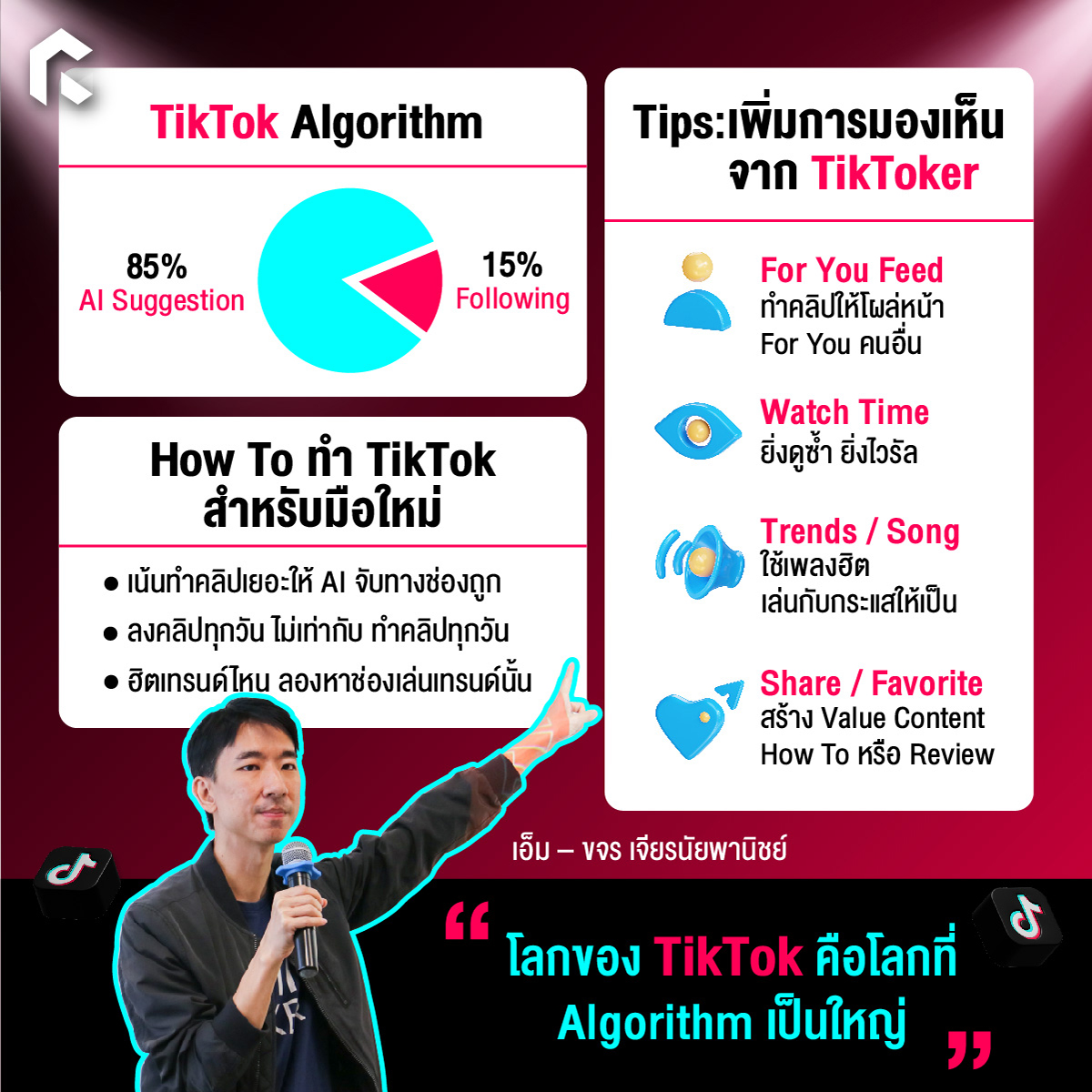 เมื่ออัลกอริทึมเป็นระบบที่มีอิทธิพลมากที่สุดบน TikTok ไม่ว่าจะทำคอนเทนต์ หรือเพิ่มการมองเห็น อัลกอริทึมจะเป็นตัวกำหนดสิ่งเหล่านั้น ฉะนั้นเราจึงต้องมีความเข้าใจอัลกอริทึมให้มาก เพื่อจะได้ไม่ต้องเสียแรงสร้างคอนเทนต์ดี แต่ไม่ถูกใจอัลกอริทึม