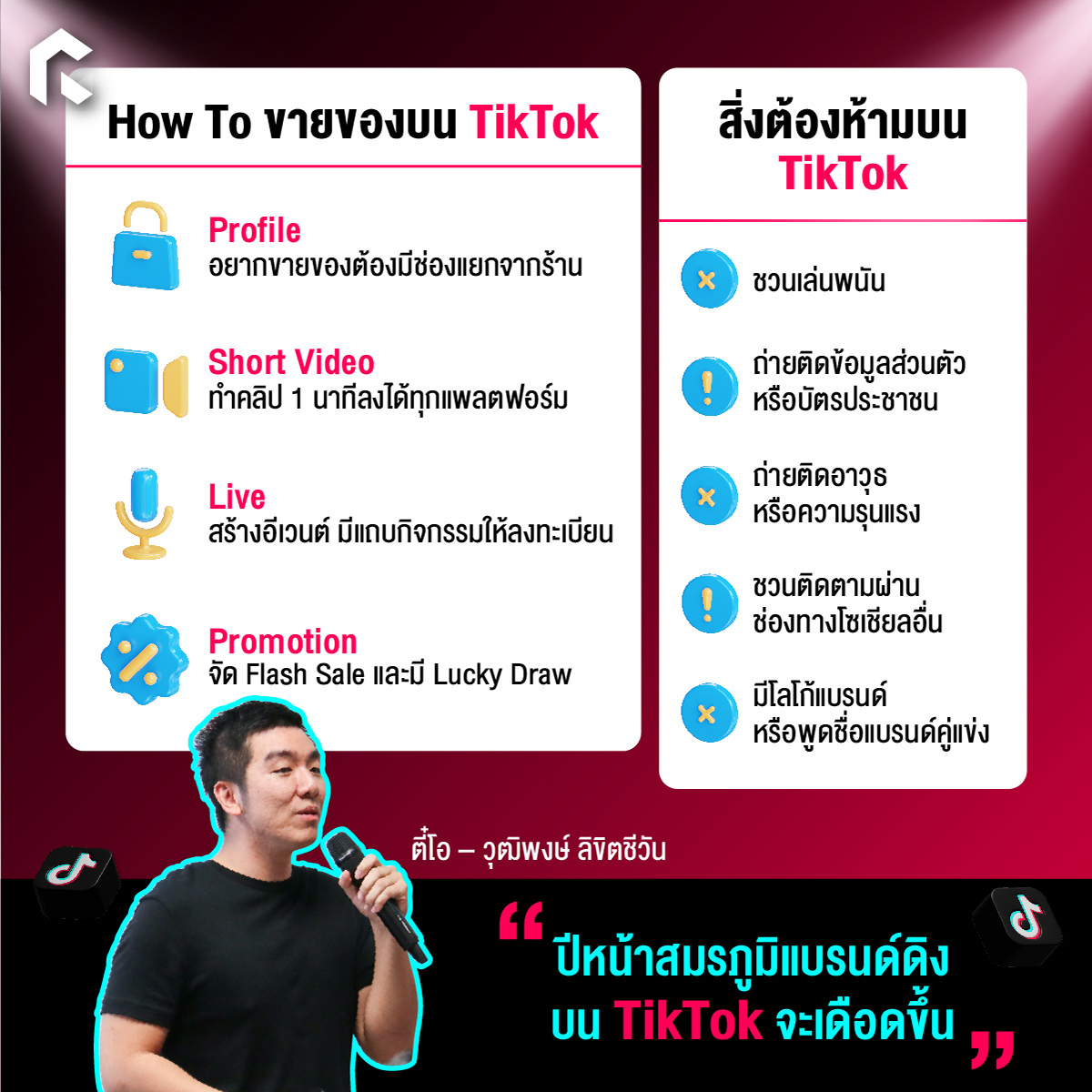 อยากขายของต้องมีช่องแยกจากร้าน และไม่ควรนำช่องที่เป็นตัวของครีเอเตอร์มาขายของปนกัน เพราะจะทำให้ชาว TiKToker จำที่ตัวแบรนด์มากกว่า และยังเป็นการสร้างแบรนด์ดิงให้ชาว TikToker คุ้นชินอีกด้วย
