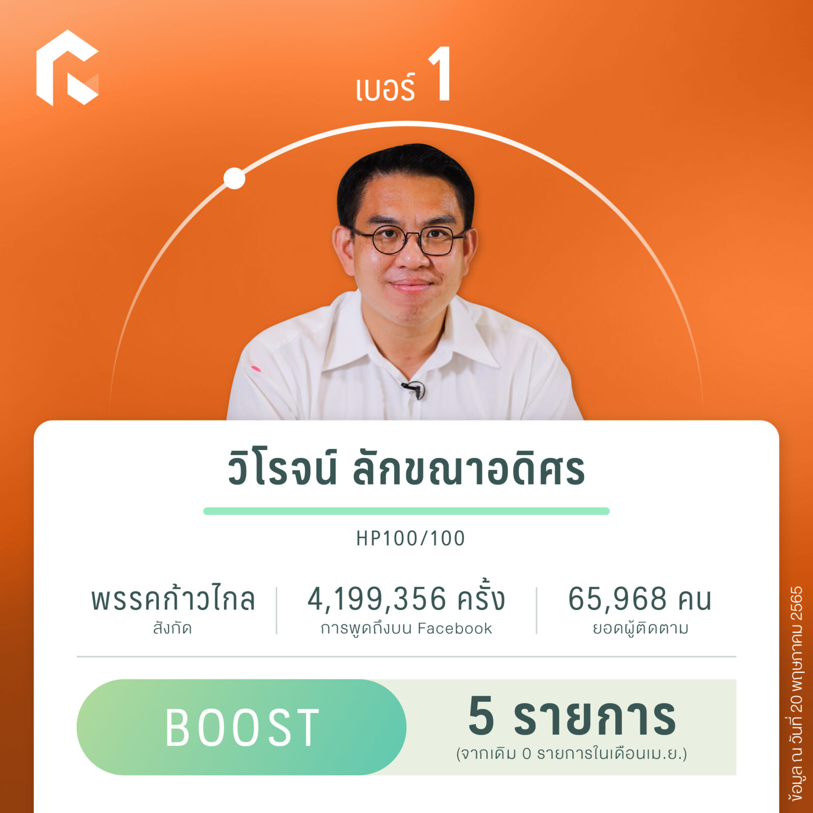 มาพร้อมกับภาพรวมนโยบายที่เน้นการสร้างเมืองที่คนเท่ากัน เพื่อลดความเหลื่อมล้ำ และยกระดับคุณภาพชีวิตของทุกคนในกรุงเทพฯ ถึงแม้บน Facebook จะไม่ได้มีการบูสต์โพสต์ แต่ผู้คนก็มีการพูดถึงวิโรจน์กว่า 4 ล้านครั้ง เพราะชาวโซเชียลต่างเริ่มให้ความสนใจเป็นอย่างมากจากการปะทะไหวพริบบนเวทีดีเบตต่าง ๆ จนเรียกได้ว่าเป็น ‘ยาแรง’ ที่วิเคราะห์ปัญหาของกรุงเทพฯ ได้อย่างตรงไปตรงมาเลยทีเดียว