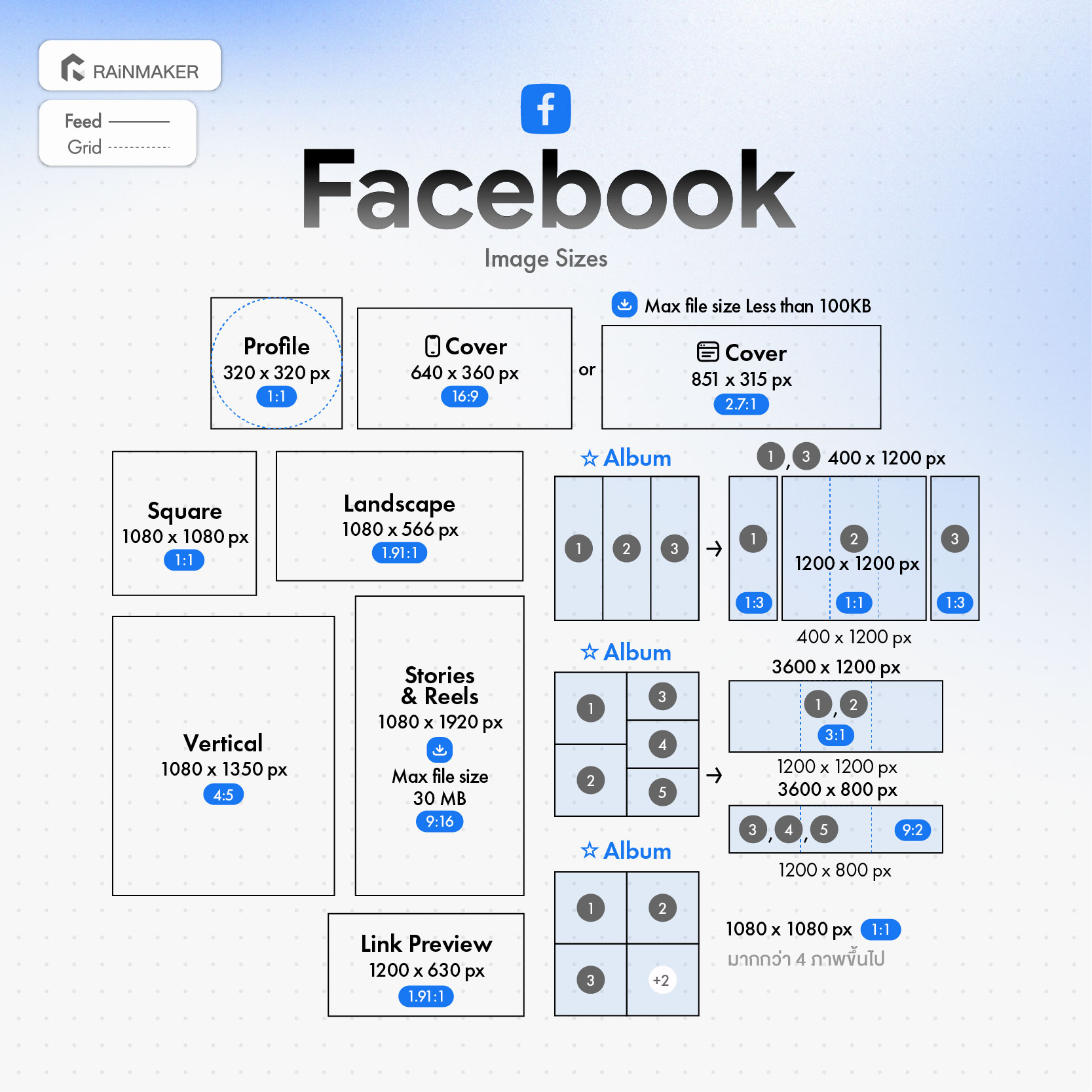 Facebook ยังคงเป็นแพลตฟอร์มที่มีรูปแบบคอนเทนต์ที่หลากหลาย โดยมีทั้งบทความ, Text Post, Photo Album ไปจนถึงวิดีโอ Reels ซึ่งจุดเด่นของ Facebook ที่หลายคนรู้กันดี คือการอัปเดตเลย์เอาต์ Photo Album ใหม่ ๆ ให้เราตื่นเต้นกันเสมอ ซึ่งวันนี้เราก็ได้รวบรวมไซซ์ภาพและวิดีโอมาให้แบบครบจบในภาพเดียว!