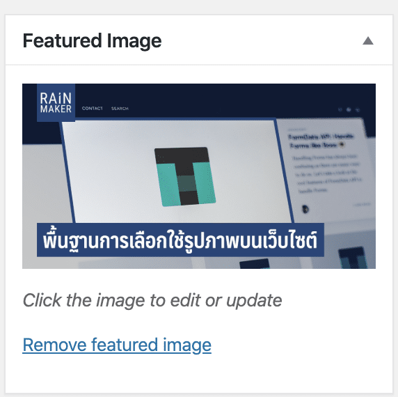 หากคุณใช้ระบบ WordPress ในการทำเว็บไซต์ ในส่วนของหน้าเขียนบทความคุณจะพบกับช่องสำหรับวางภาพปกของบทความ หรือ Fratured Image อยู่ที่ด้านขวามือ