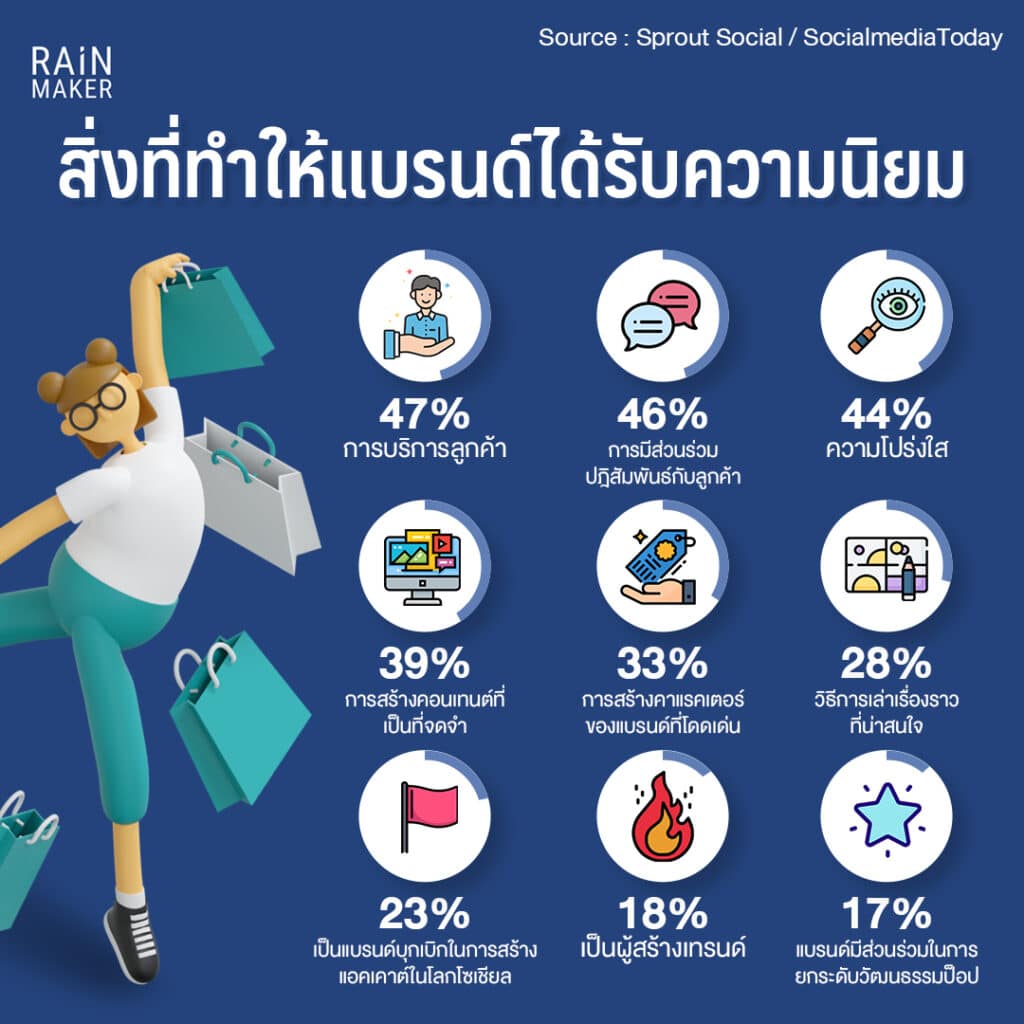 เมื่อถามถึงสิ่งที่ทำให้แบรนด์ได้รับความนิยม จากอินโฟนี้ จะเห็นได้ว่า ผู้บริโภคส่วนใหญ่โหวตให้ “การบริการลูกค้า” ทั้งก่อนและหลังการขาย เพื่อสร้างประสบกรณ์ที่ดีให้กับลูกค้า ซึ่งก็ได้ให้คะแนนมากกว่าการเป็นผู้สร้างเทรนด์ หรือร่วมเล่นคอนเทนต์เรียลไทม์ซะอีก
