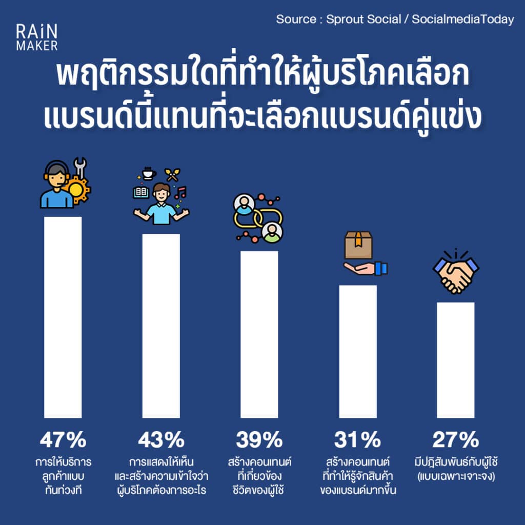 และเมื่อถามว่า พฤติกรรมใดที่ทำให้ผู้บริโภคเลือกแบรนด์นี้แทนที่จะเลือกแบรนด์คู่แข่ง ความเห็นอันดับหนึ่งได้แก่ “การให้บริการลูกค้าแบบทันท่วงที” ได้ไป 47% สิ่งนี้ค่อนข้างตีความได้อย่างชัดเจน หากแบรนด์ต้องการทำให้การมีตัวตนบนโซเชียลมากที่สุด เมื่อมีพื้นที่บนโลกโซเชียลมากเท่าไหร่ ก็แปลว่าจะมีคนมองเห็นแบรนด์ และมีคำถามหรือการติดต่อเพิ่มขึ้นเช่นเดียวกัน หากแบรนด์สามารถตอบกลับได้อย่าง “ทันท่วงที” ก็จะเพิ่มความชื่นชอบของผู้ใช้ที่มีต่อแบรนด์ได้