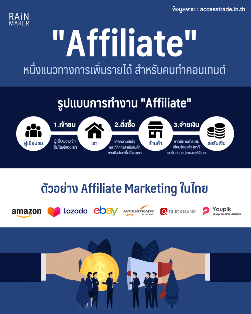 หากการเขียนคอนเทนต์ปกติของเราในทุกวันสามารถทำรายได้ให้เราเพิ่ม คงจะเป็นอะไรที่ดีมากสำหรับในช่วงนี้ “Affiliate Marketing” สามารถตอบโจทย์ในเรื่องนี้ได้ วันนี้เราจะพาไปทำความรู้จักว่า Affiliate คืออะไร รูปแบบการทำงานเป็นอย่างไร และเราจะหารายได้เพิ่มจากสิ่งนี้ได้ยังไง